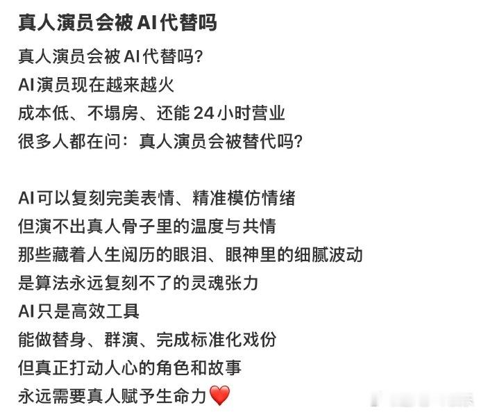 真人演员会被AI代替吗 很多人担心演员行业被AI冲击,可AI只能按设定走流程,真人演员能即兴发挥能带入生活感悟,这就是无可替代的核心优势