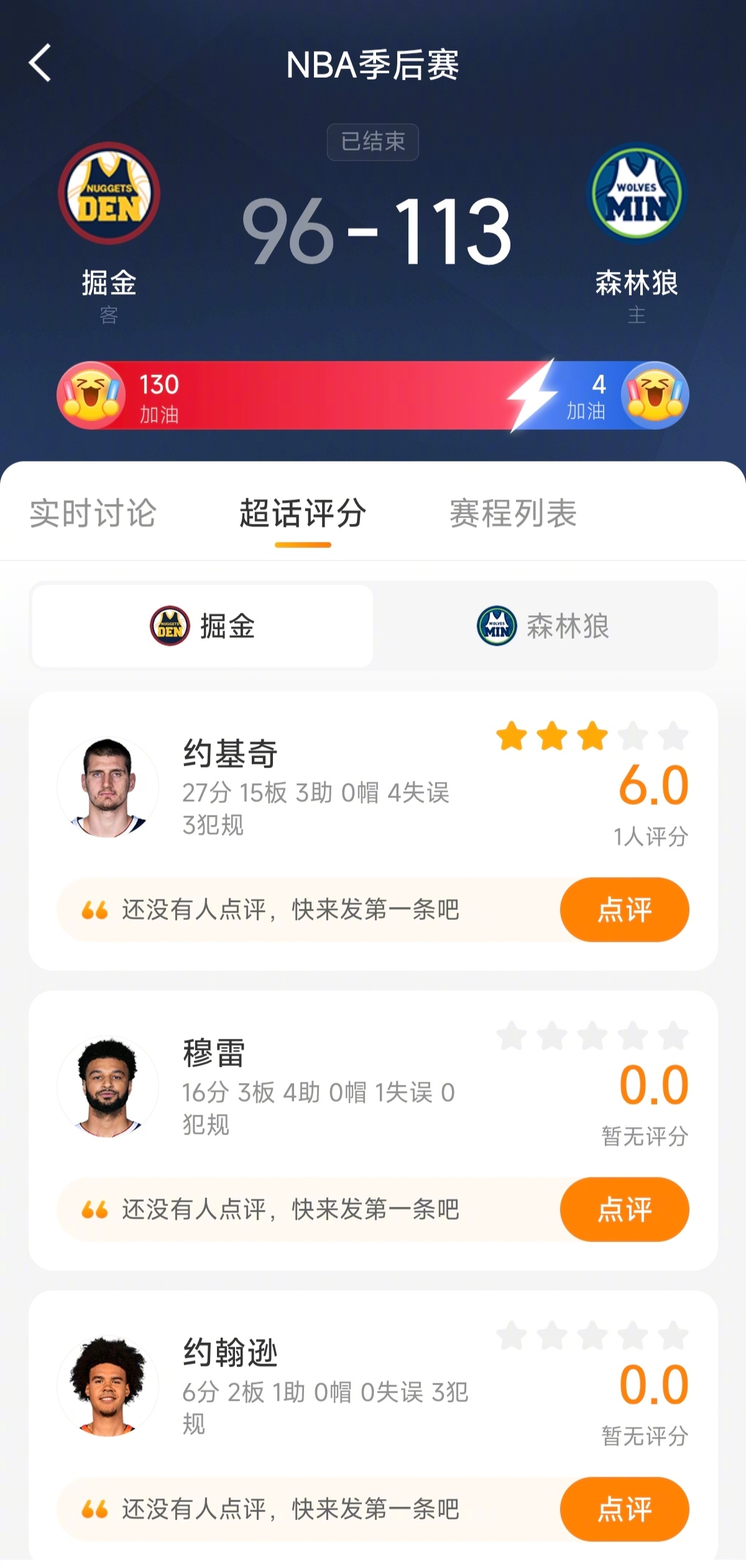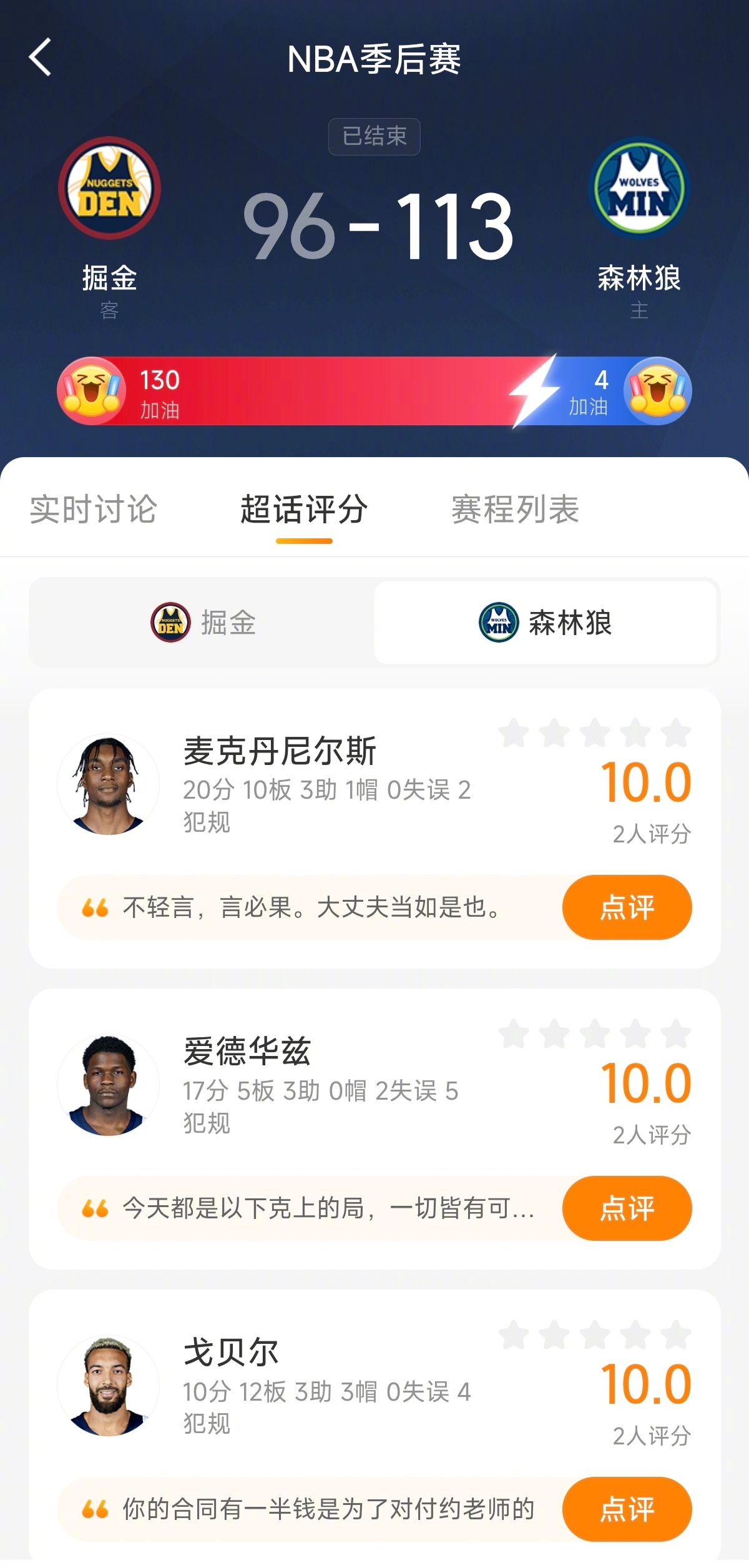 一起来超话NBA明尼苏达森林狼丹佛掘金为球员表现评分,有机会赢取20元神评红包激励~掘金vs森林狼