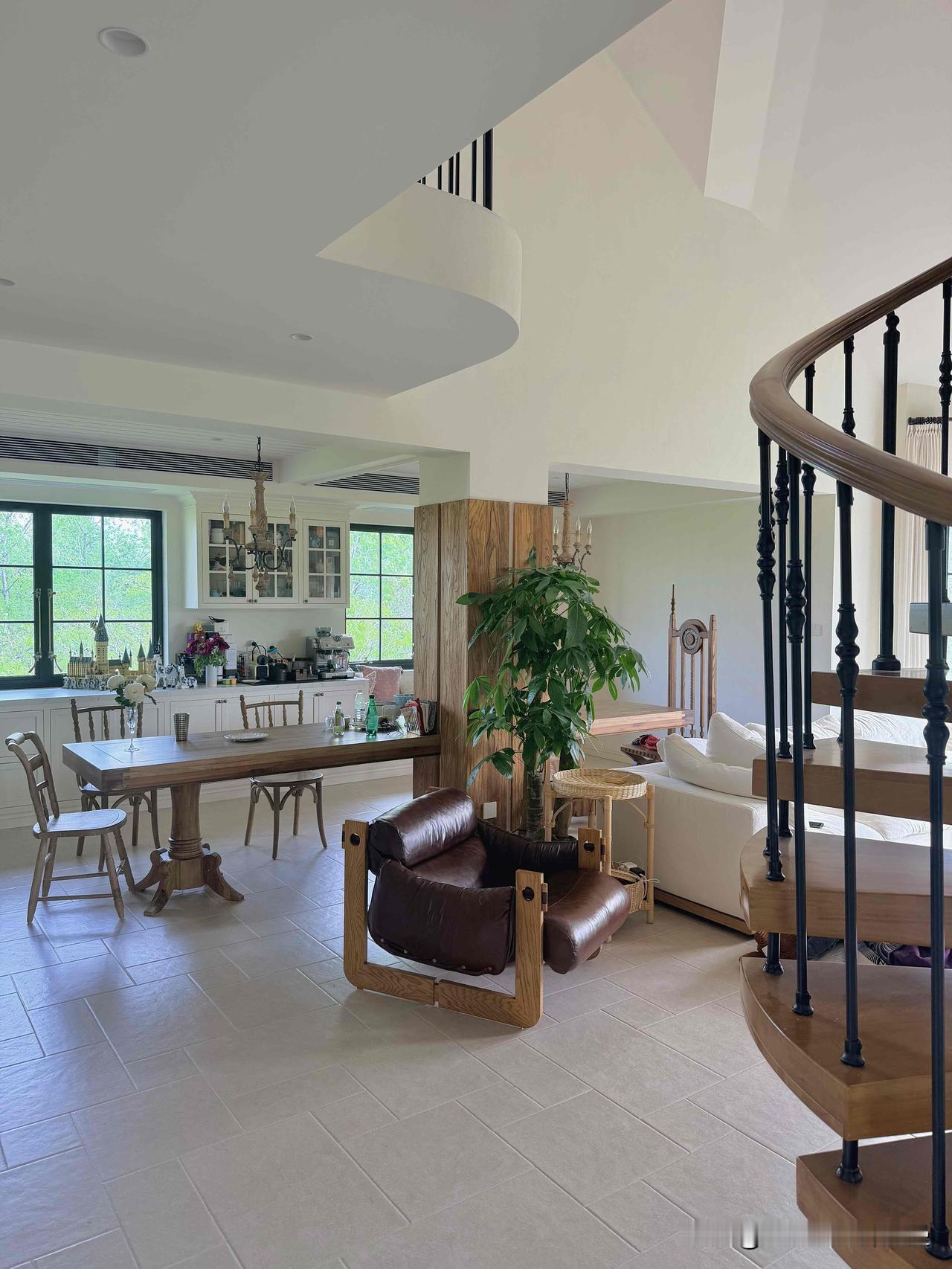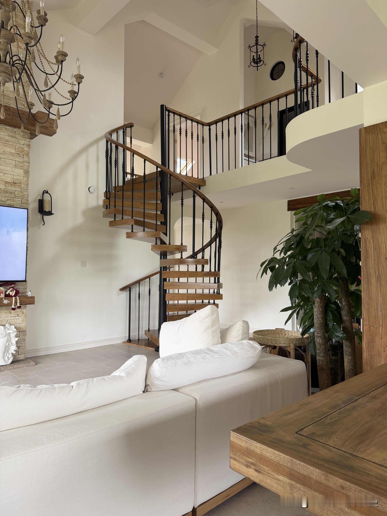 • 保留原始挑高,用旋转楼梯替代直梯,既不挡光,又成了全屋的复古打卡点。天窗的自然光顺着斜顶洒下来,连灰尘都在发光~