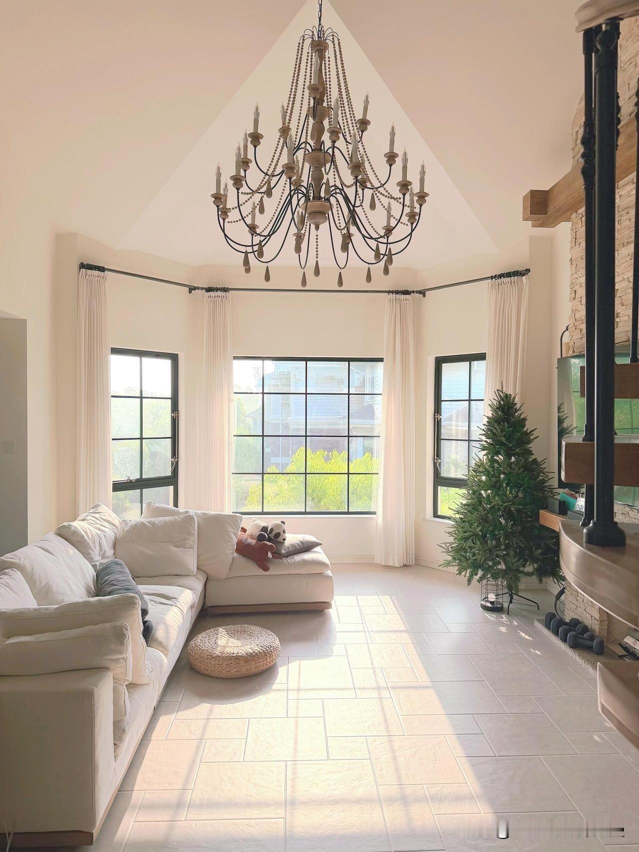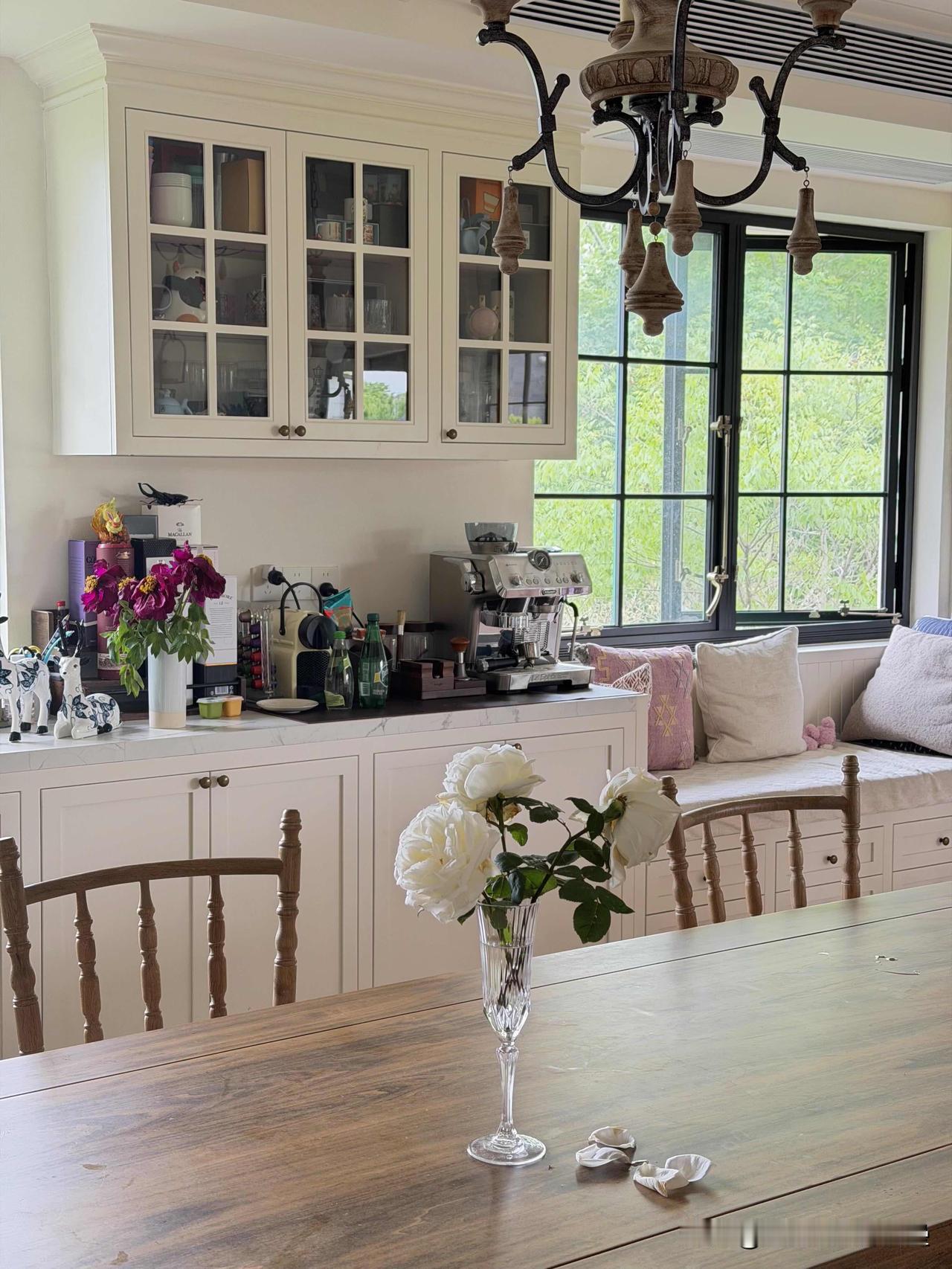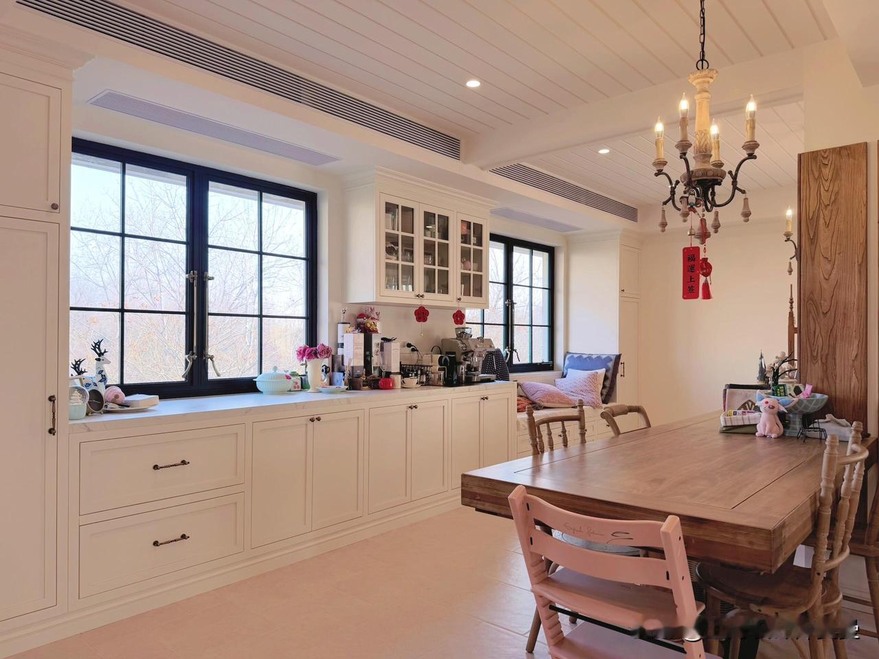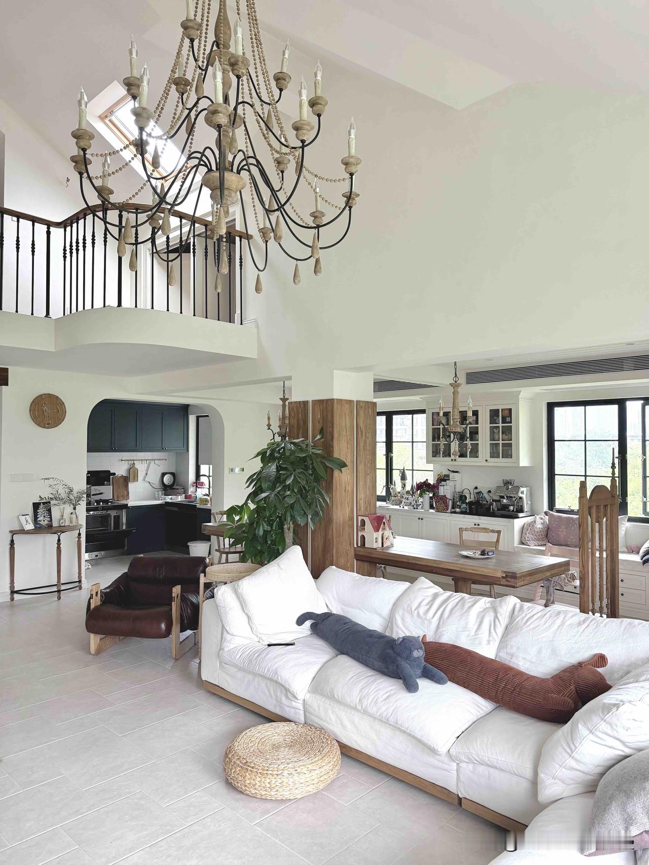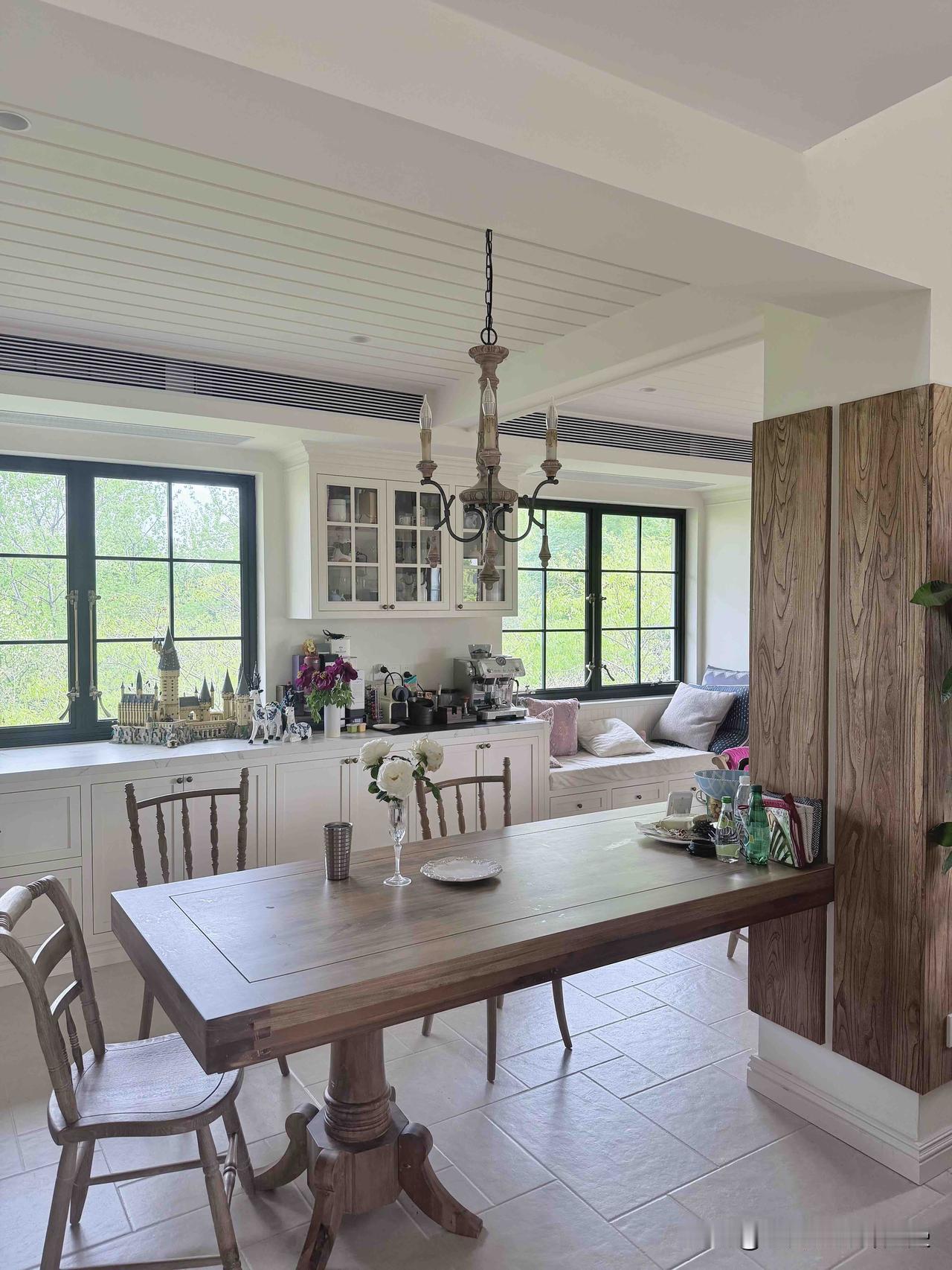 • 全屋奶白乳胶漆+黑色窗框+做旧实木家具,美式乡村的松弛感直接拉满,没有多余硬装,全靠软装质感撑住氛围。