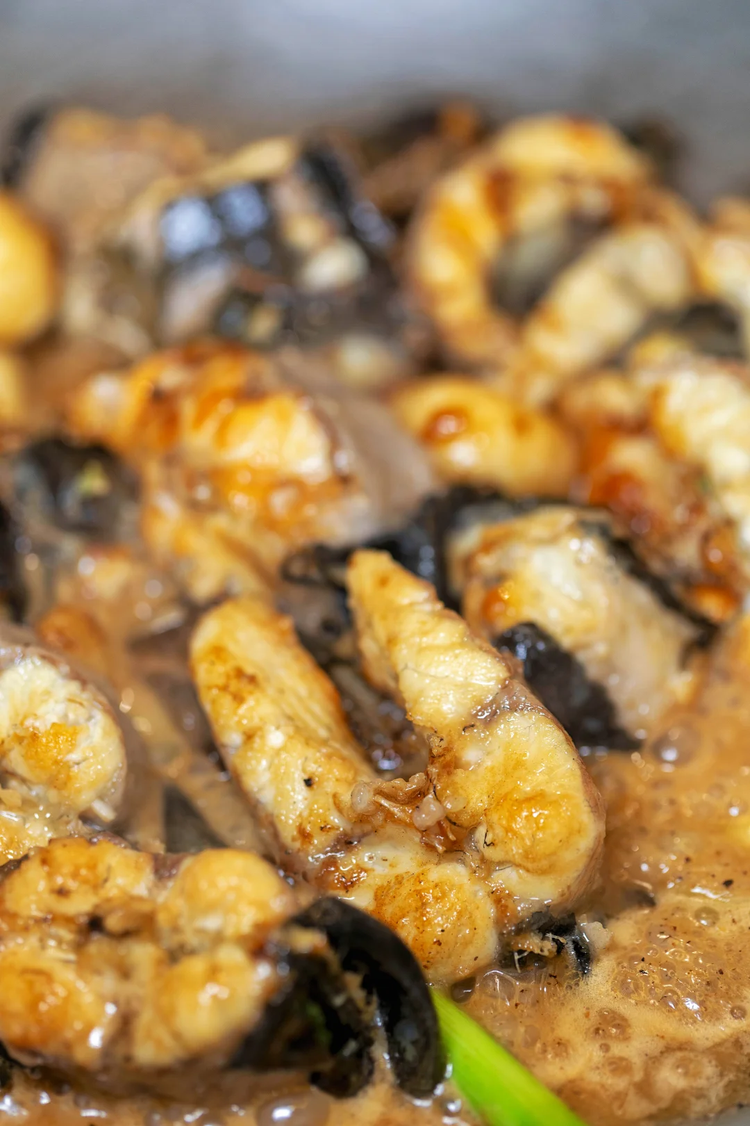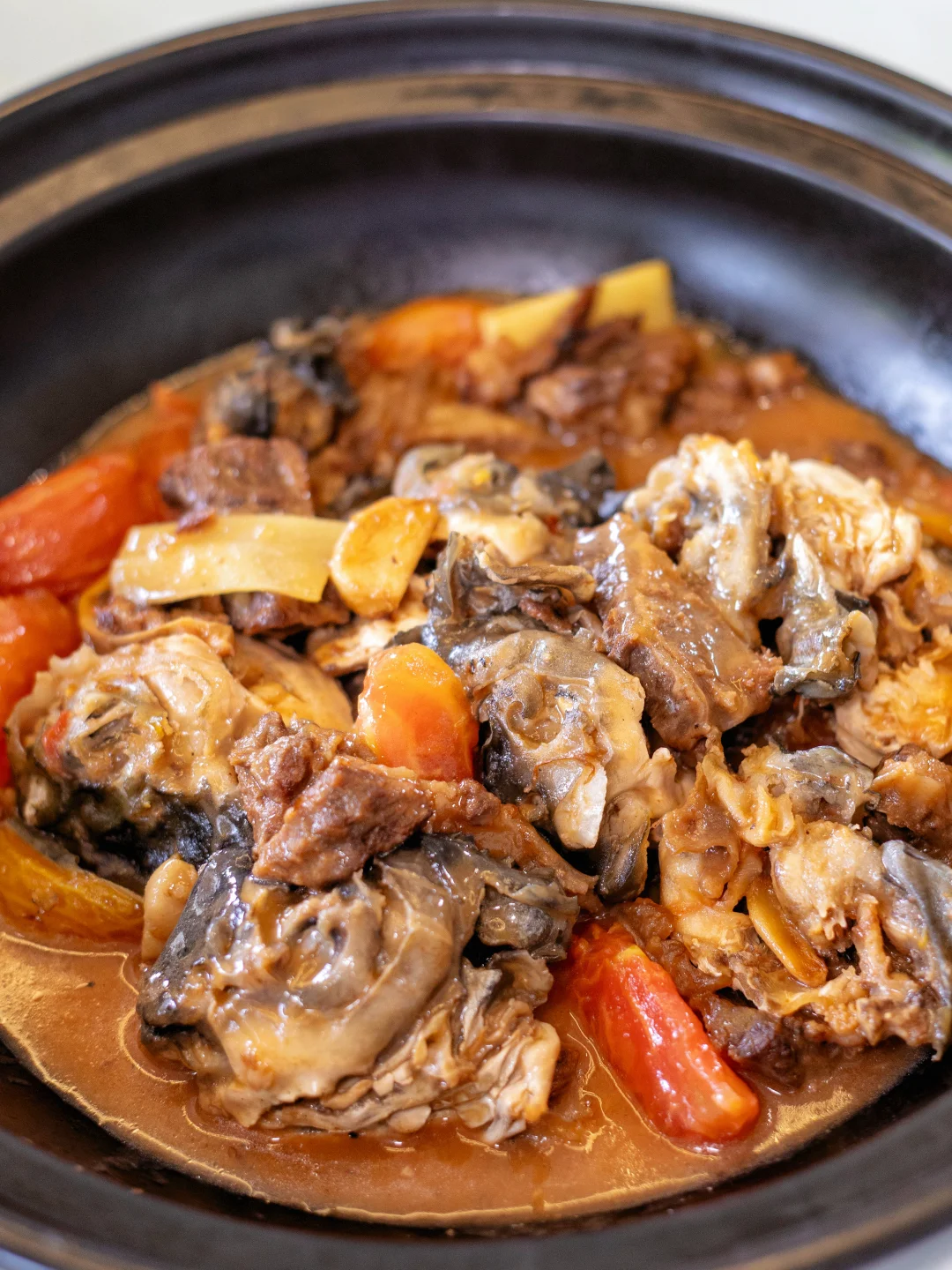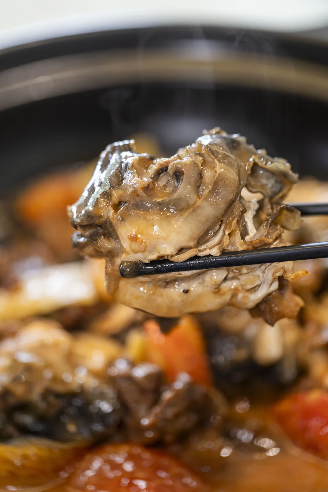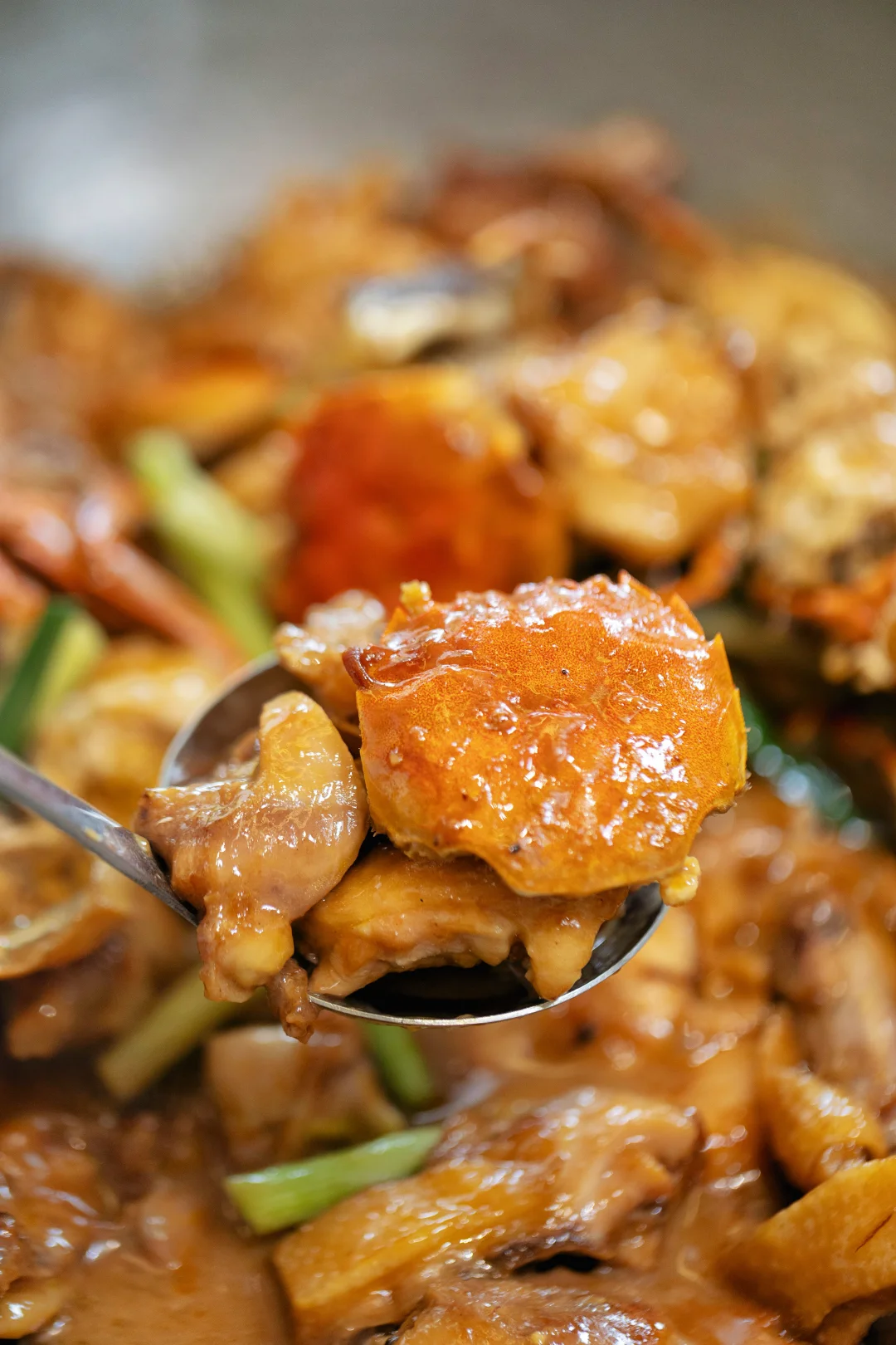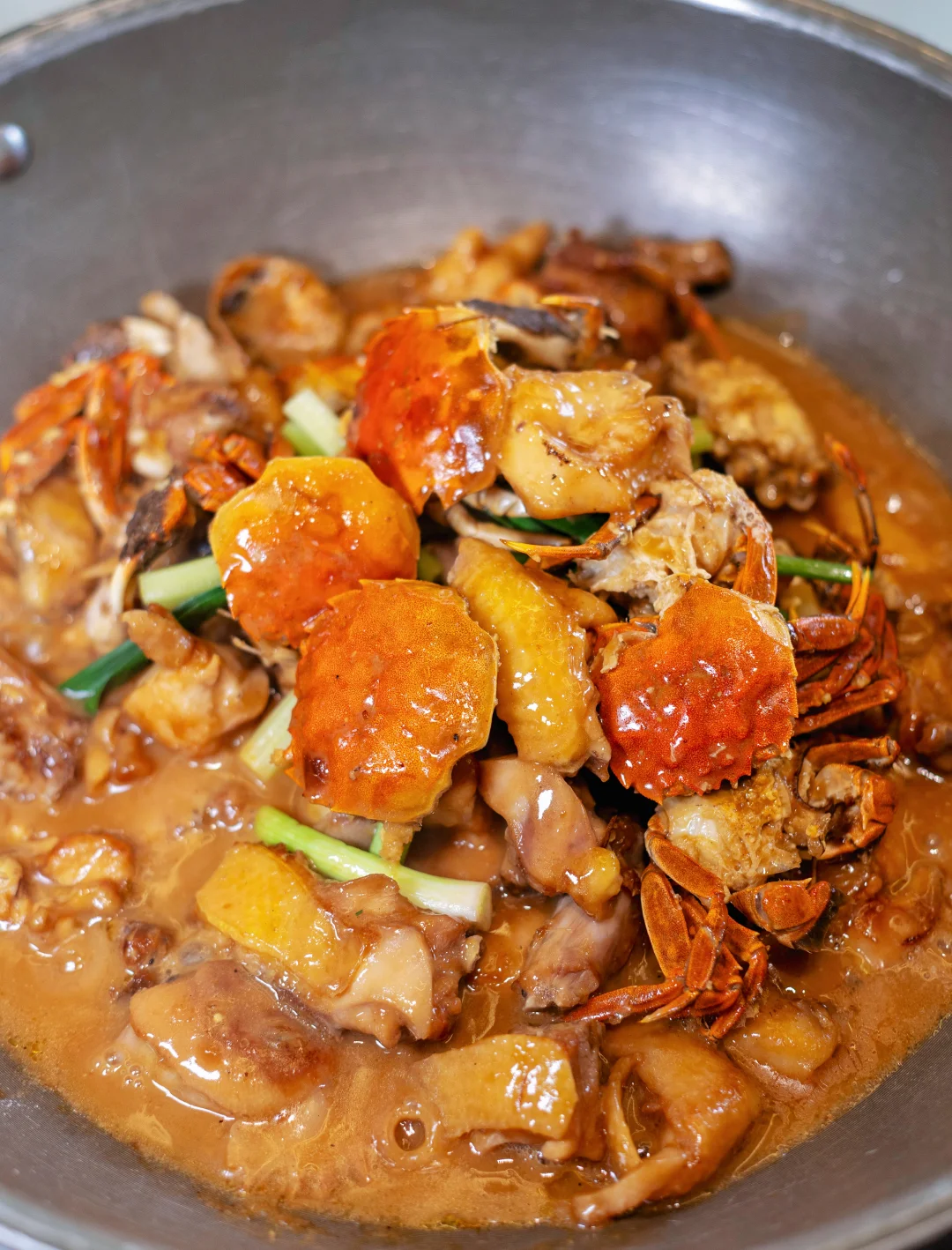 焖煮时蟹的鲜气完完全全渗进鸡肉肌理里。鸡肉吸饱了蟹膏的香和酱汁的浓,咬开还锁着汁水,鲜得连手指都要舔三遍。