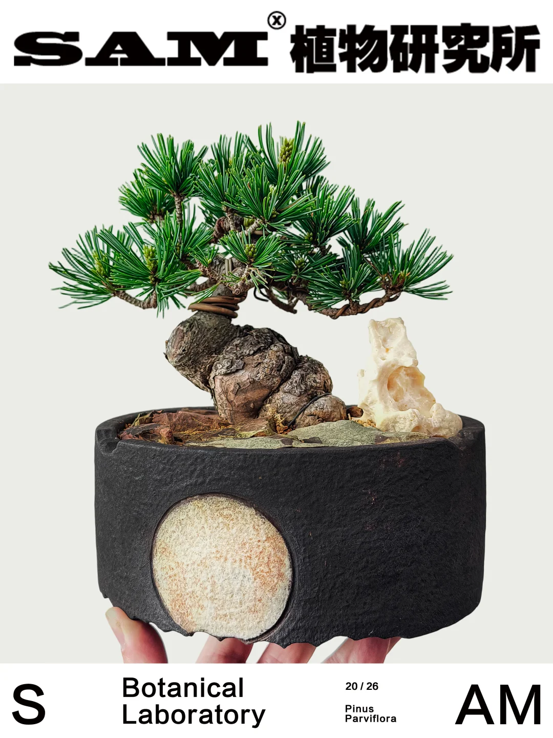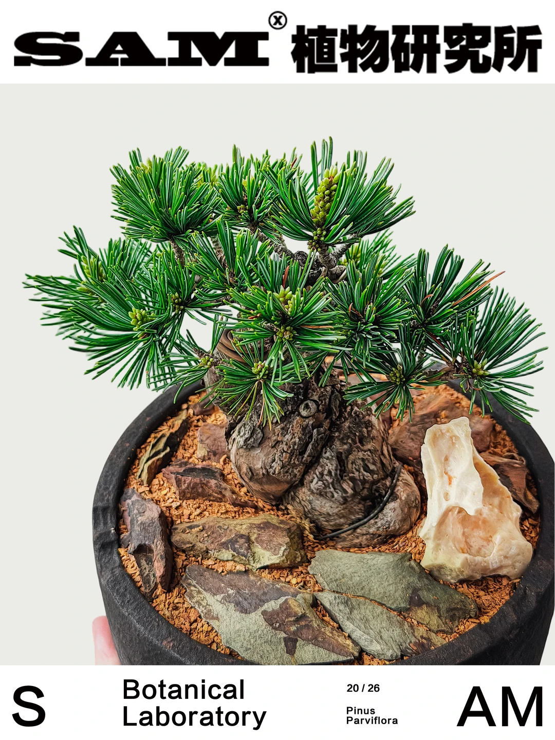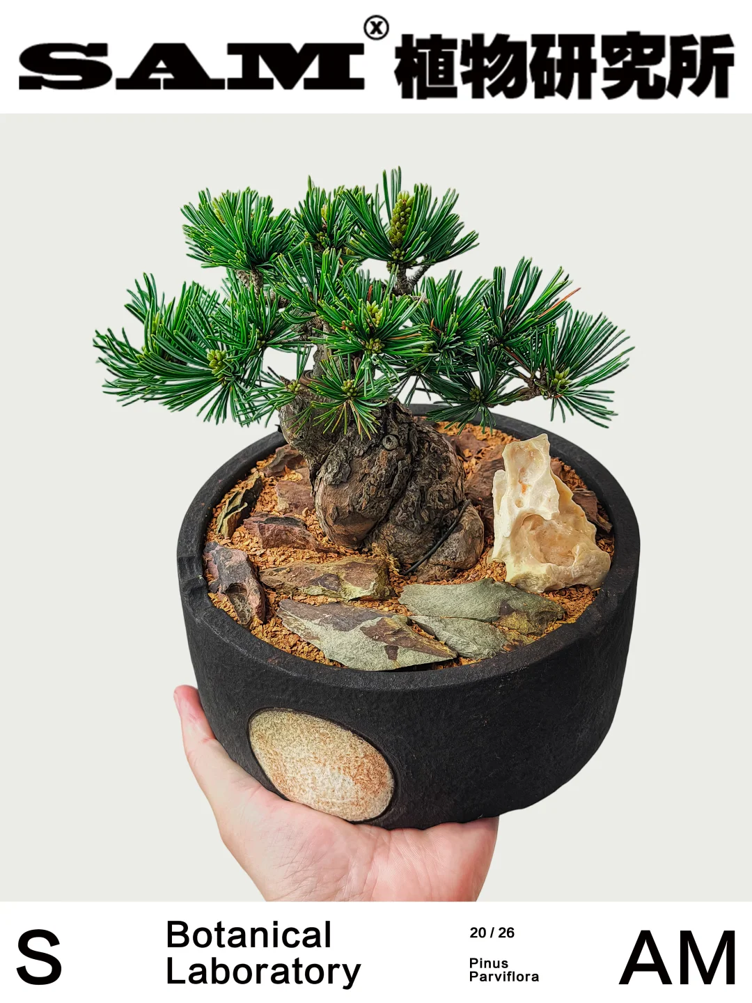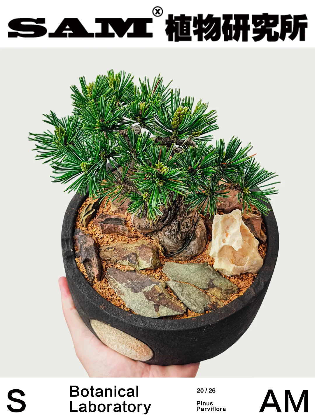 💚Tips:SAM植物研究所全新系列产品——宋式美学盆景,以松柏为骨,以陶盆为墨,将宋人风雅凝于方寸之间。不求繁茂,但见风骨。循古法之势,删繁就简,一枝一节,皆有去留——如山脊隐现,似行云将止。在方寸里复刻东方时间,以宫岛大阪松、千寿丸、金针、瑞光五针松、济州真柏、系鱼川真柏等精品松柏为骨,重塑其枝势与呼吸的节奏。线条趋于克制与留白——像一幅未尽的山水,意在枝外。不同于传统盆景的规整叙事,它更接近宋代的审美逻辑:简、远、寒、瘦。有些植物,不为取悦季节,而为承载时间。松柏缓生,造型亦缓。需以时日驯之、以耐心养之,在不动声色间,渐得其势。它承接块根审美的当代属性,却敛其锋芒;又借宋式美学的留白与克制。在松的世界里,五针松向来被视为更接近“文气”的存在。不同于黑松的刚烈,它更内敛、清雅,仿佛自带一层雾气。瑞光之名,亦暗含“温润之光”的意象——不是锋芒毕露,而是久看生辉。枝不求满,留有行气;形不求奇,自成山势。海报中的五针松因五叶丛生而得名。苍劲有形,盆器是SAM家满月系列块根盆,于日月之间见乾坤。
