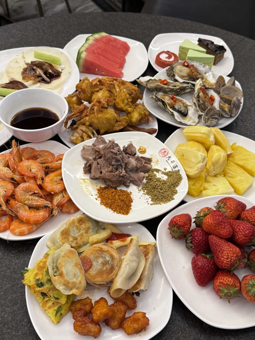 现烤生蚝不限量炫,肥嫩爆汁一口满足!烤鸭、烤羊、铁板牛排、日料甜品全都有!