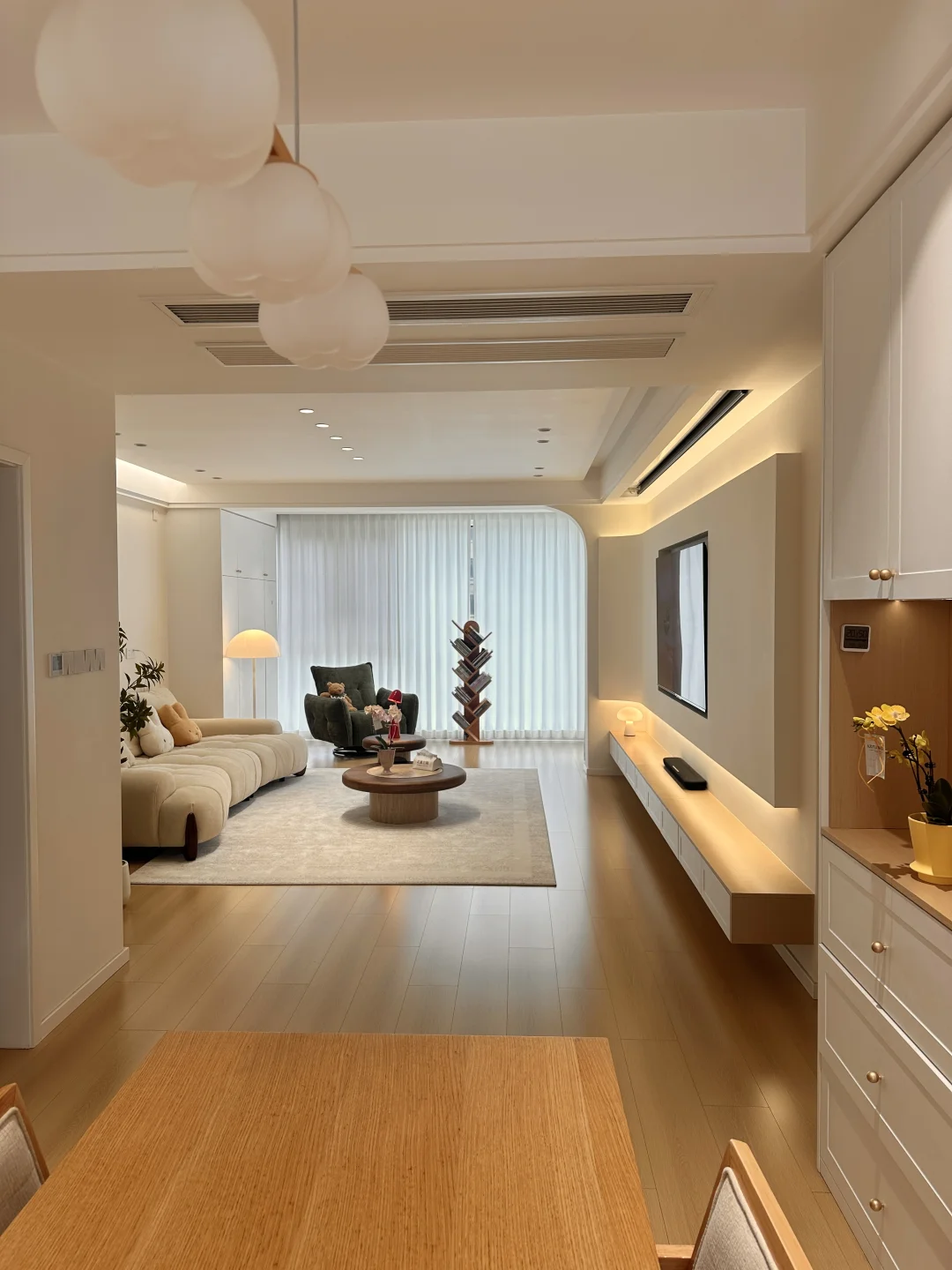 我的小家套内108,原木极简风,原木色➕白色的配色真的好温馨,客厅无主灯,米色系沙发,一块有质感又柔软的地毯,温柔的落地灯,一切都刚刚好~