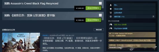 《刺客信条:黑旗 记忆重置》是育碧对2013年经典之作《刺客信条4:黑旗》的一次现代重制,育碧现已官宣本作将于7月9日正式发售,支持中配,Steam国区售价248元。