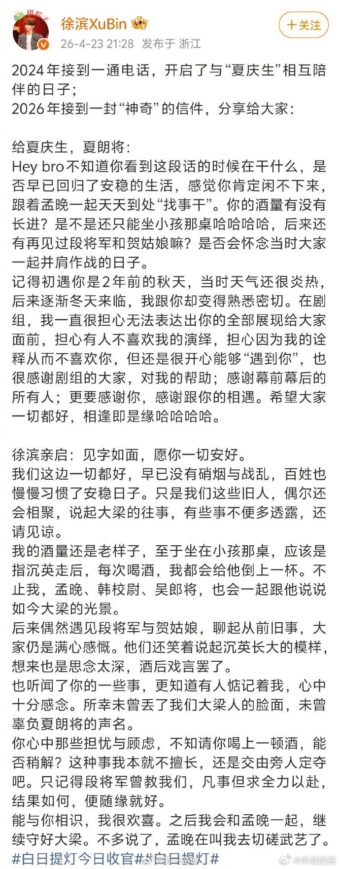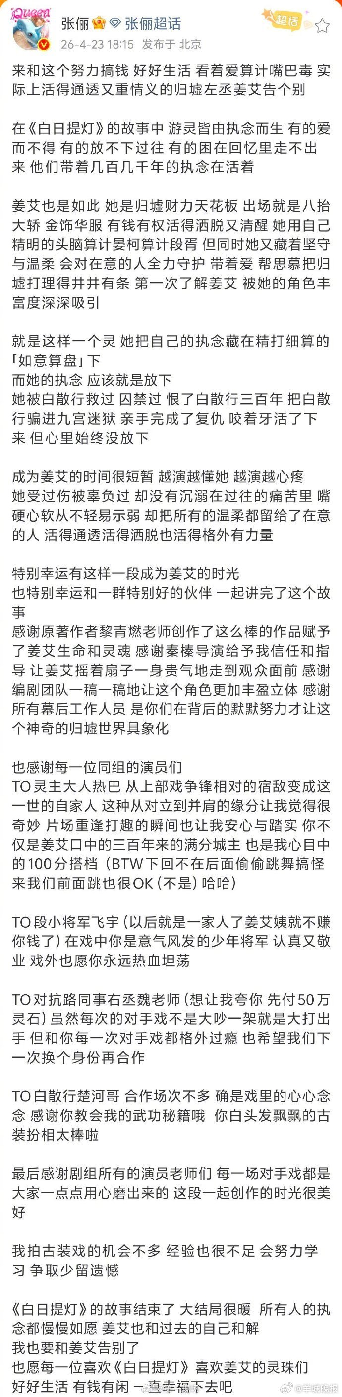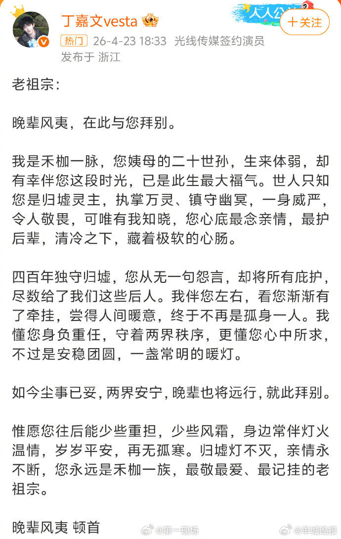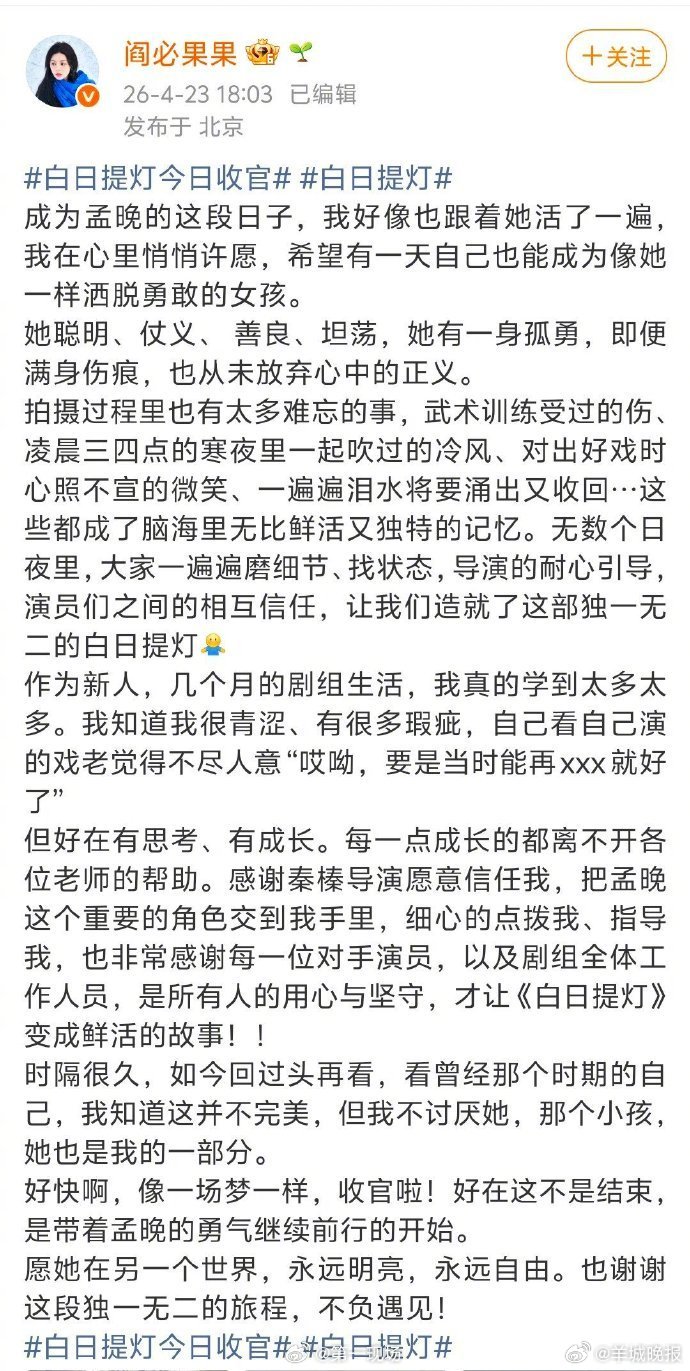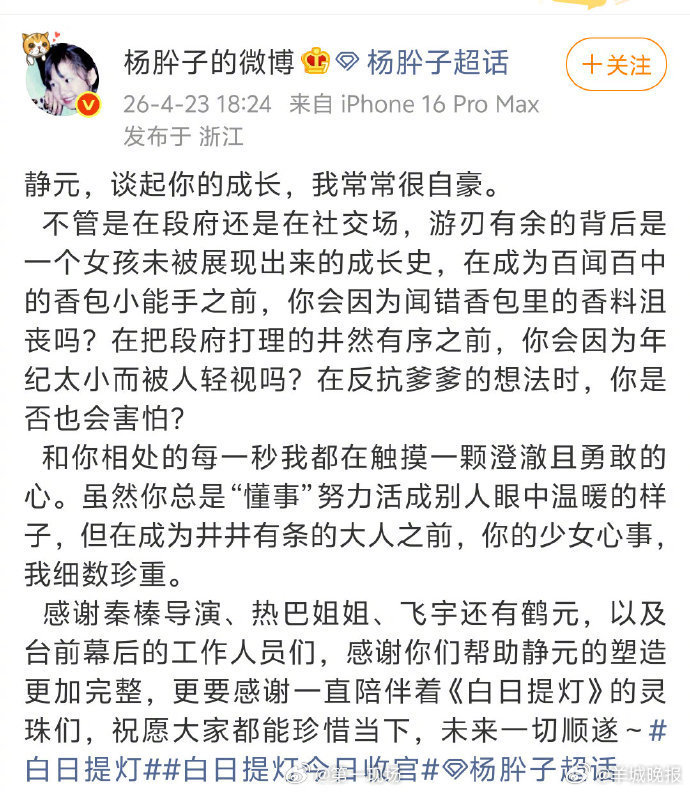 【#白日提灯收官日全员长文告别角色# 】迪丽热巴于2026年4月23日晚发布千字长文告别《白日提灯》中的角色贺思慕,以细腻笔触剖析角色从孤寂神明到感知人间爱的蜕变历程,引发全网观众共鸣。