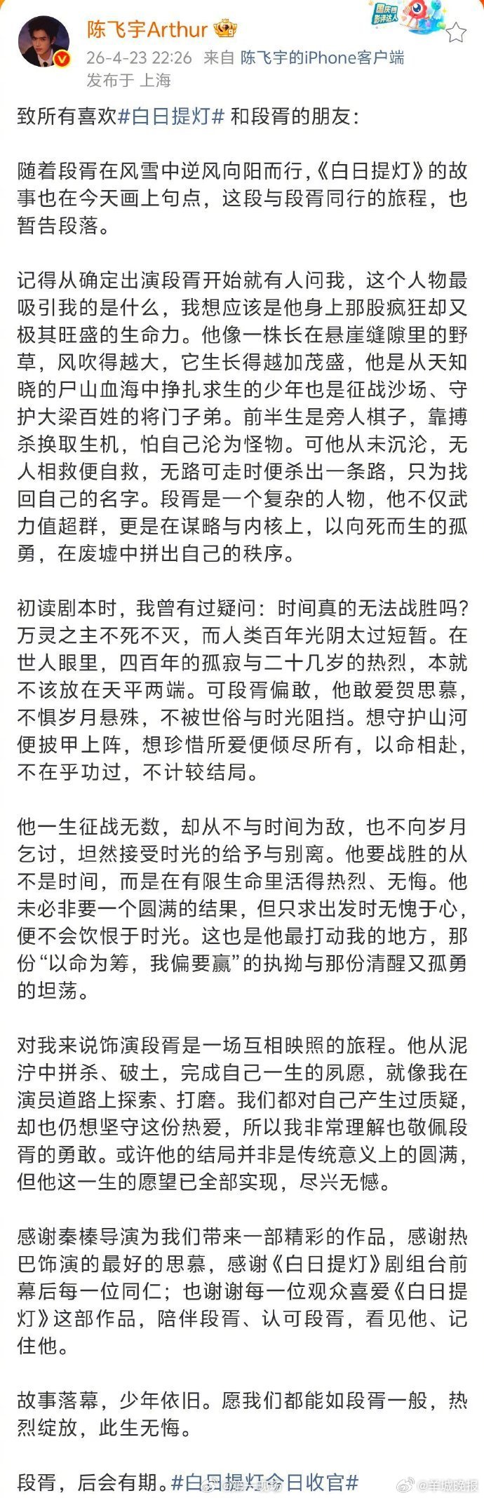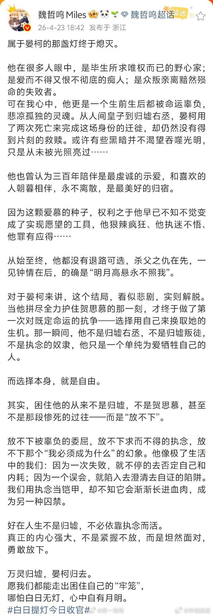 不仅如此,《白日提灯》收官日形成“全员长文告别”现象:陈飞宇剖析段胥“向死而生的孤勇”,张俪解读姜艾“精打细算下的执念”,魏哲鸣诠释反派晏柯“被命运辜负的悲凉”。这种集体创作投入被观众誉为内娱罕见的真诚剧组仪式。(第一现场)更多消息:#黄旭熙 可以爆料了吗##傅首尔怎么了##曝留几手想复婚##韩承羽宣布结婚生女##张彬彬郑业成KO美人师兄售后##冰湖重生算扑吗#(编辑:惠天骄;审签:谢杨柳)
