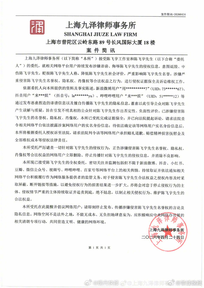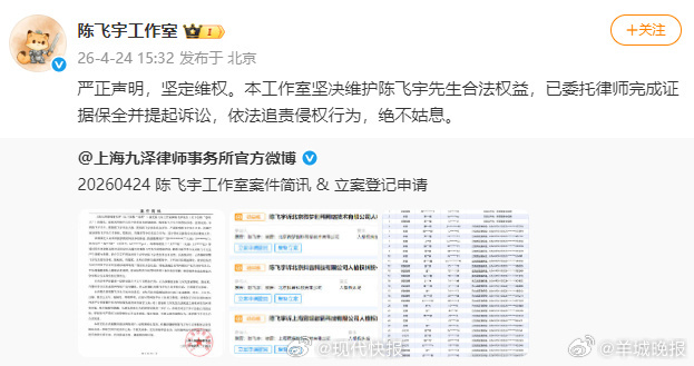 #陈飞宇方公开30条维权进展# 4月24日,发布维权声明:本工作室坚决维护先生合法权益,已委托律师完成证据保全并提起诉讼,依法追责侵权行为,绝不姑息。其委托的律师公布案件简讯&立案登记申请,针对相关网络用户发布涉嫌诽谤、侮辱陈飞宇的侵权信息,进行证据保全及诉讼维权工作,并公开了30条维权进度。(现代快报)更多消息:#黄旭熙 可以爆料了吗##傅首尔怎么了##冰湖重生算扑吗##曝留几手想复婚##张彬彬郑业成KO美人师兄售后##高云翔和第一任妻子是和平分手#(编辑:惠天骄;审签:谢杨柳)