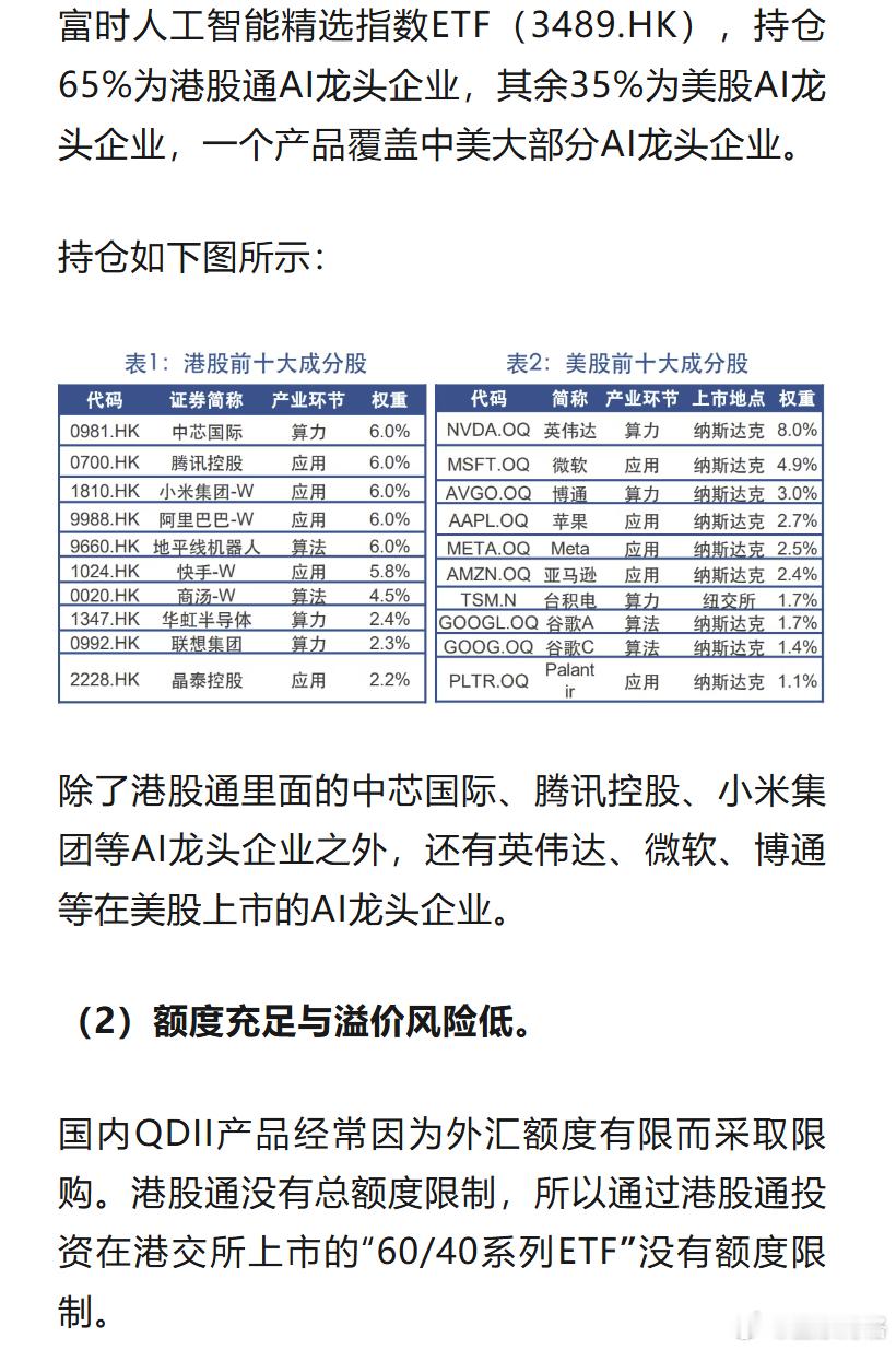 突然发现:互联互通新规里面有“金矿”~今天研究了一下,新纳入港股通标的两个(在港交所上市)ETF:3483.HK与3489.HK,顿时感觉沪深港通互联互通新规里面有“金矿”啊。大家不要着急,博格先给大家捋一捋这个“互联互通机制”:2014年11月,沪港通开通;2016年12月,深港通开通。北向资金可以买卖A股,南向资金可以买卖港股,这些股票必须在沪港通的投资范围里面。2018年5月,沪深港通扩大每日额度。港股通(南向)没有总额度限制,仅保留每日买入额度控制。沪港通、深港通下的港股通各420 亿元人民币 / 日,两市独立计算、互不共用。博格特意去查了一下数据,截止2025年8月份北向资金累计净买入A股1.76万亿人民币,截止2026年4月份南向资金累计净买入港股5.36万亿港币,南向资金显著高于北向资金。2022年7月,ETF纳入沪深港通标的范围,2024年7月,扩大沪深港通ETF标的的范起初沪深港通标的范围的只有股票,在此之后开始纳入ETF了。具体包含陆股通ETF 225只(在沪深交易所上市的),港股通ETF 16只(在港交所上市 的),港股通ETF数量偏少。2025年11月,港股通纳入“60/40系列ETF”“60/40系列ETF”是指数成份股中,港股通的股票权重不低于60%、其余成份股配置其他海外区域股票的指数类型。聊到这里就是今天的关键内容了,博格之前提到沪深港通互联互通新规里面的“金矿”就是这个“60/40系列ETF”。“60/40系列ETF”具体优势如下:(1)不低于60%投资港股通股票资产,不高于40%可以直投海外股票资产,持仓灵活性强。 例如:MSCI亚太精选高股息指数ETF(3483.HK),持仓65%为港股通高股息股票,其余35%为亚太(日本、澳大利亚等)高股息股票,这样可以使得持仓地域与行业更加多元化。持仓如下图所示:除了港股通里面的中国石油、中国神话、工商银行等高股息股之外,还有必和必拓、软银、福蒂斯丘等在日本或澳大利亚上市的高股息股。富时人工智能精选指数ETF(3489.HK),持仓65%为港股通AI龙头企业,其余35%为美股AI龙头企业,一个产品覆盖中美大部分AI龙头企业。持仓如下图所示:除了港股通里面的中芯国际、腾讯控股、小米集团等AI龙头企业之外,还有英伟达、微软、博通等在美股上市的AI龙头企业。(2)额度充足与溢价风险低。国内QDII产品经常因为外汇额度有限而采取限购。港股通没有总额度限制,所以通过港股通投资在港交所上市的“60/40系列ETF”没有额度限制。同时也因为没有额度限制,“60/40系列ETF”出现溢价的风险非常低。(3)没有涨跌幅限制。“60/40系列ETF”是在港交所上市,根据港交所规则,这类ETF没有刚跌的限制的,相比而言弹性更大。今天公告3483.HK、3489.HK正式纳入港股通范围,并自2026年5月6日起生效。