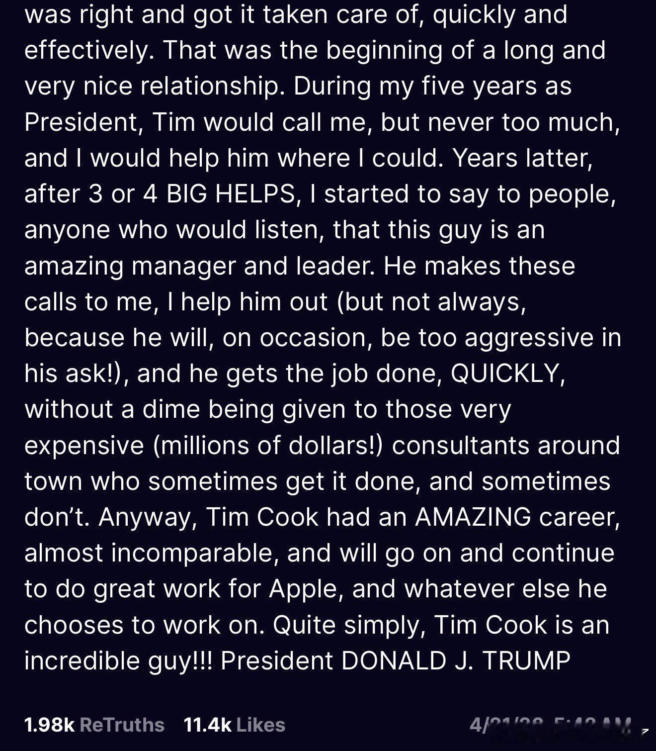 总之,Tim Cook 的职业生涯非常出色,几乎无可比拟。未来无论是在苹果,还是在他选择投身的其他领域,他都会继续做出卓越的成绩。简单来说,Tim Cook 真的是个了不起的人!!!”