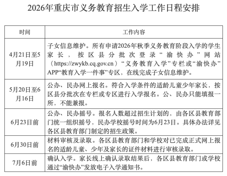 根据重庆市教委2026年义务教育招生入学工作安排,今年沿用教育入学“一件事”招生报名系统进行线上报名。目前,渝中区、城口县等区县已开启子女信息维护工作。如何在“报名系统”中维护子女信息?需上传哪些类型材料?近日,重庆市教委发布了2026年义务教育入学“一件事”招生平台常见问题解答,一一进行了讲解。