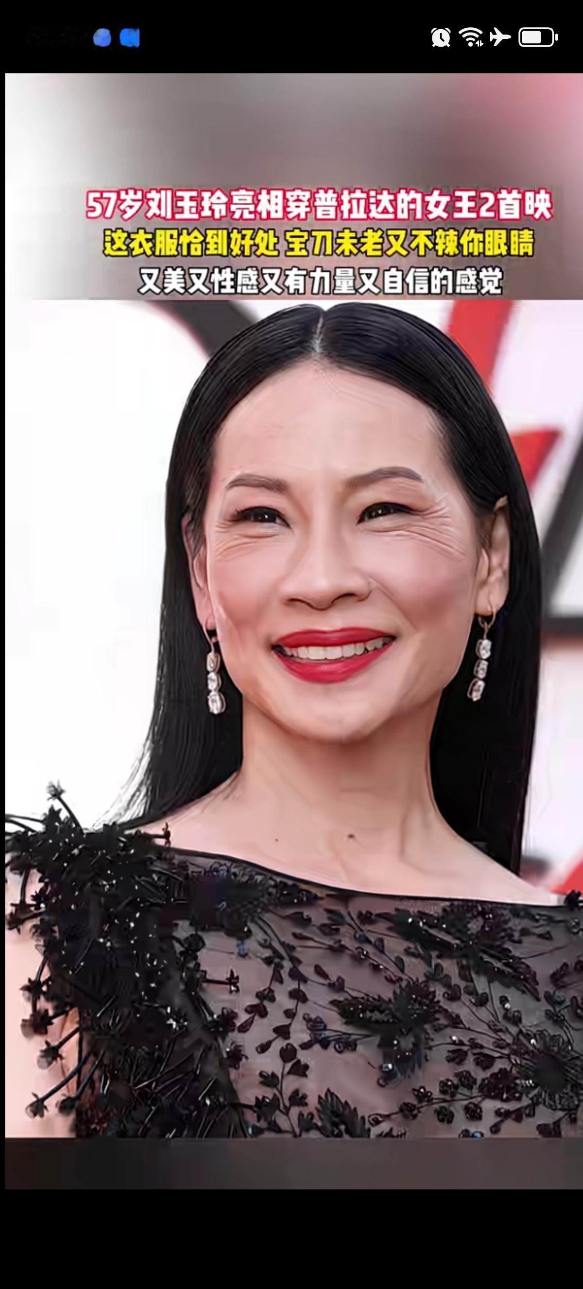 57岁的刘玉玲在《穿普拉达的女王2》首映红毯上穿着时尚、前卫,又大胆。一身黑色的