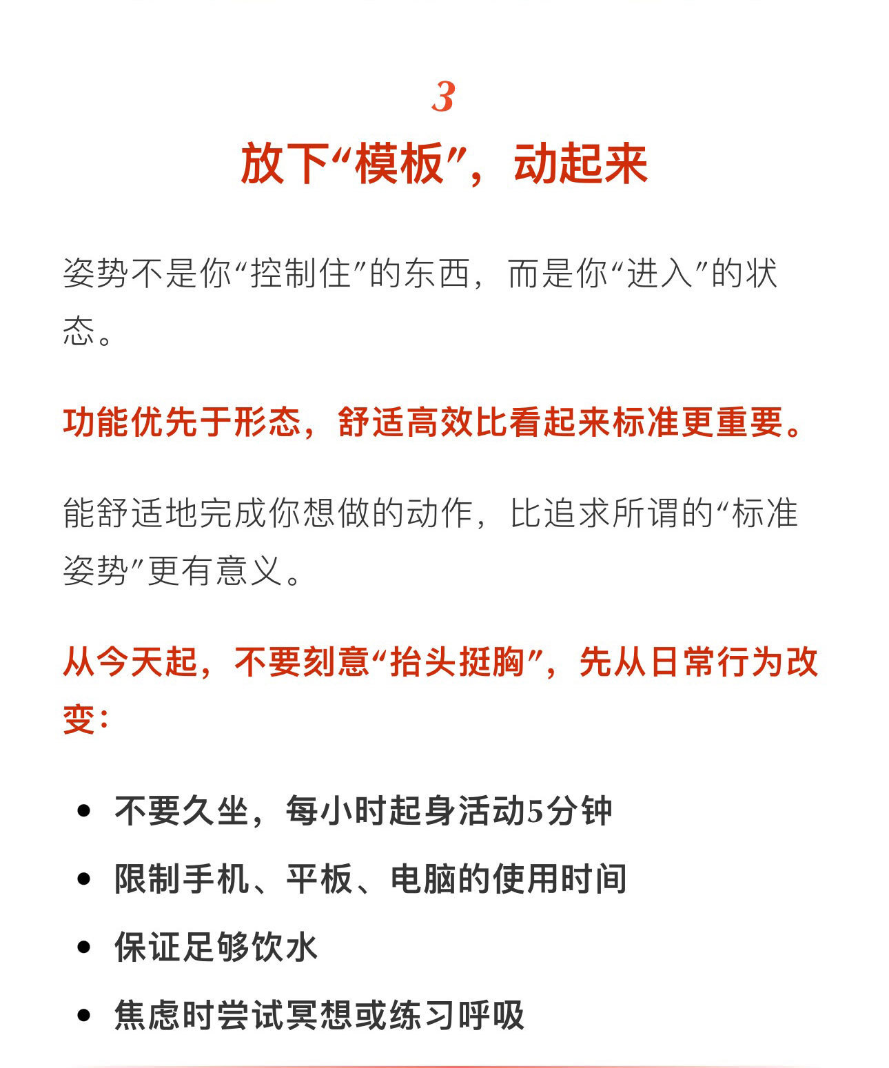 从今天起,不要刻意“抬头挺胸”,先从日常行为改变:——不要久坐,每小时起身活动5分钟——限制手机、平板、电脑的使用时间——保证足够饮水——焦虑时尝试冥想或练习呼吸