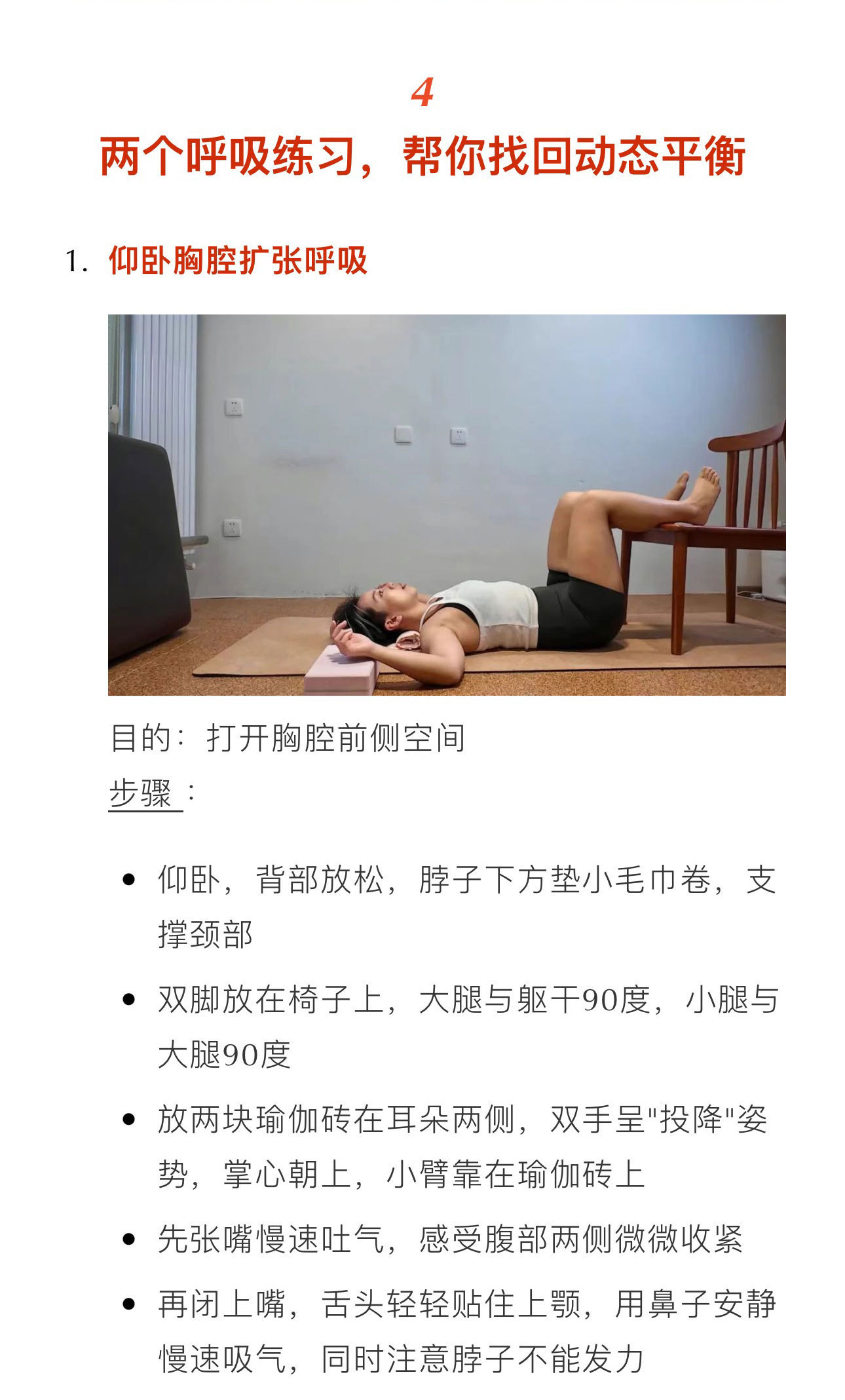04【两个呼吸练习,帮你找回动态平衡】——仰卧胸腔扩张呼吸目的:打开胸腔前侧空间步骤 :· 仰卧,背部放松,脖子下方垫小毛巾卷,支撑颈部· 双脚放在椅子上,大腿与躯干90度,小腿与大腿90度· 放两块瑜伽砖在耳朵两侧,双手呈"投降"姿势,掌心朝上,小臂靠在瑜伽砖上· 先张嘴慢速吐气,感受腹部两侧微微收紧· 再闭上嘴,舌头轻轻贴住上颚,用鼻子安静慢速吸气,同时注意脖子不能发力