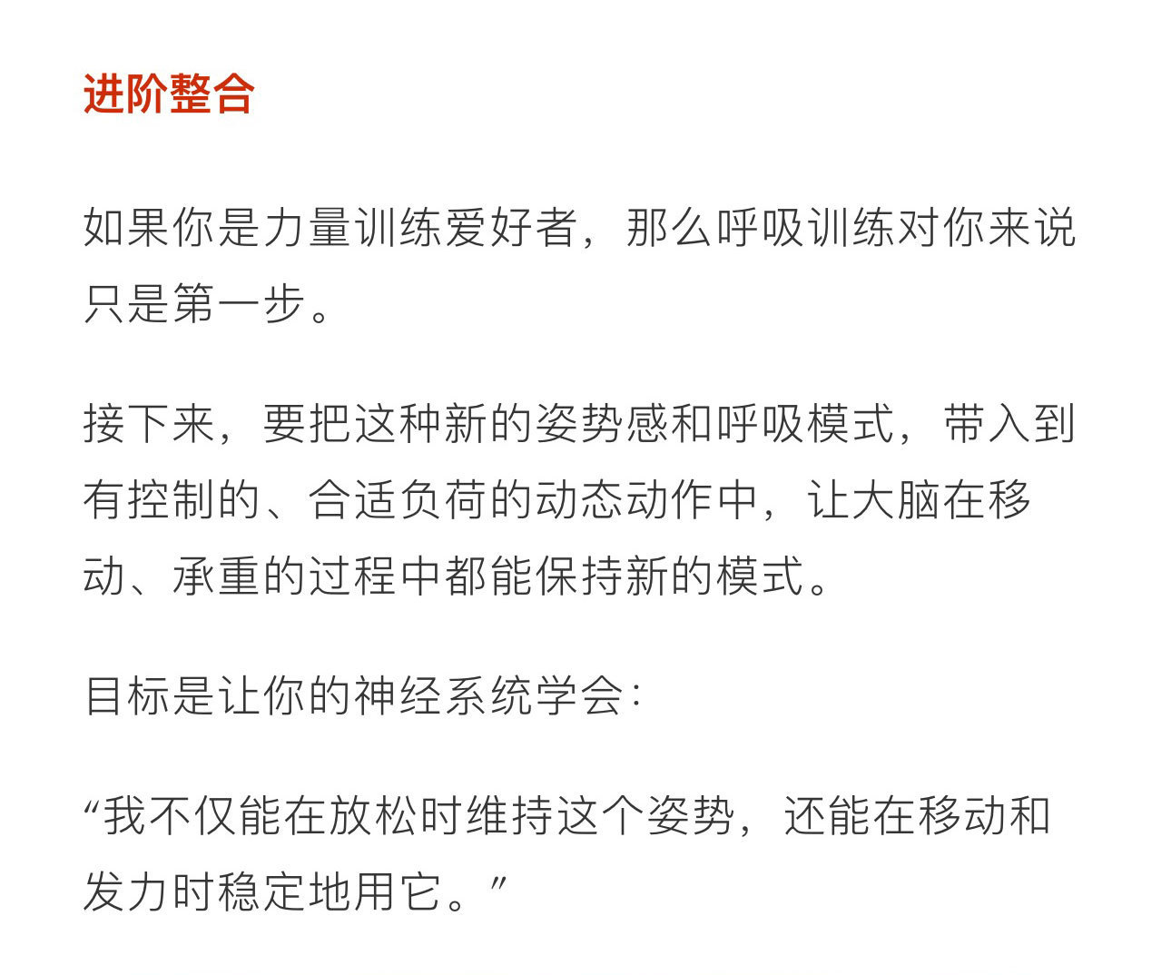 ——进阶整合如果你是力量训练爱好者,那么呼吸训练对你来说只是第一步。接下来,要把这种新的姿势感和呼吸模式,带入到有控制的、合适负荷的动态动作中,让大脑在移动、承重的过程中都能保持新的模式。