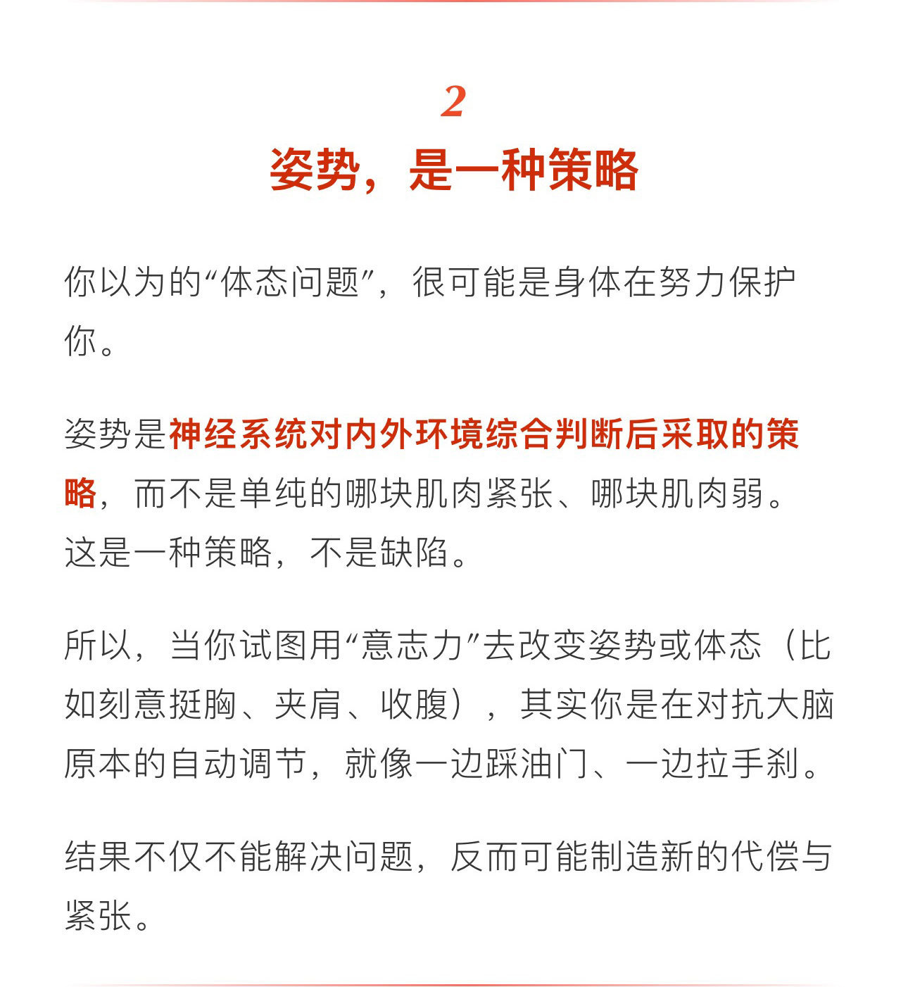姿势是神经系统对内外环境综合判断后采取的策略,而不是单纯的哪块肌肉紧张、哪块肌肉弱。这是一种策略,不是缺陷。所以,当你试图用“意志力”去改变姿势或体态(比如刻意挺胸、夹肩、收腹),其实你是在对抗大脑原本的自动调节,就像一边踩油门、一边拉手刹。结果不仅不能解决问题,反而可能制造新的代偿与紧张。