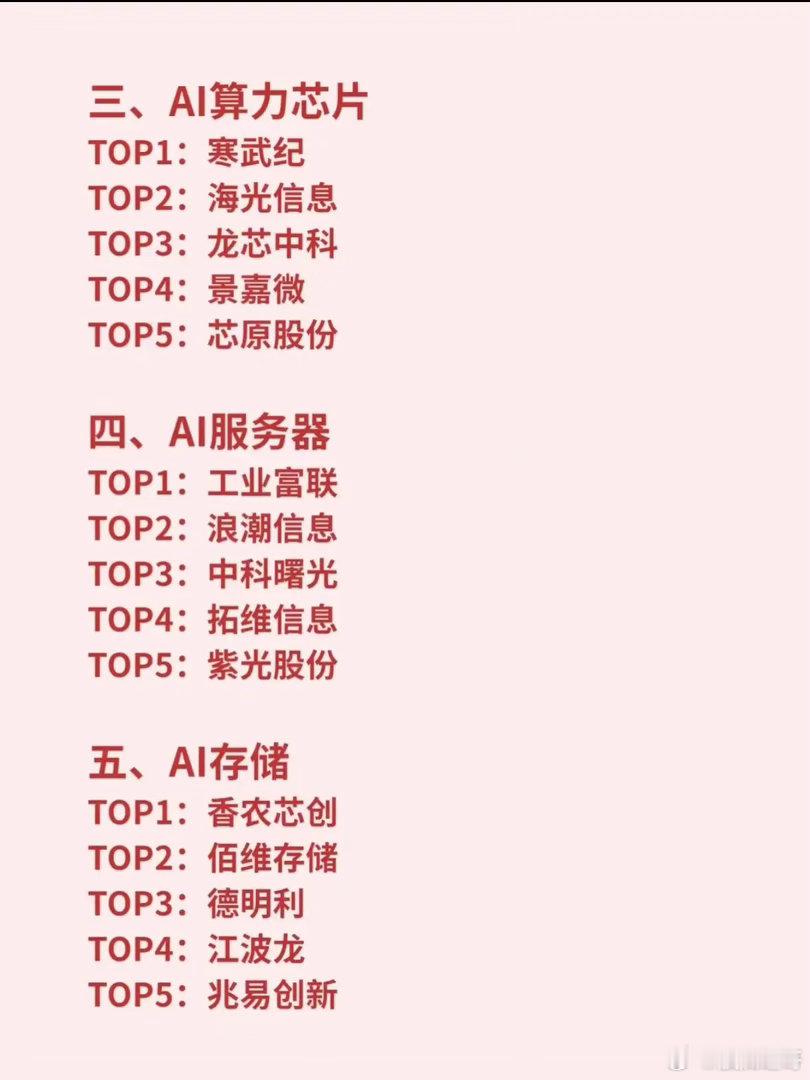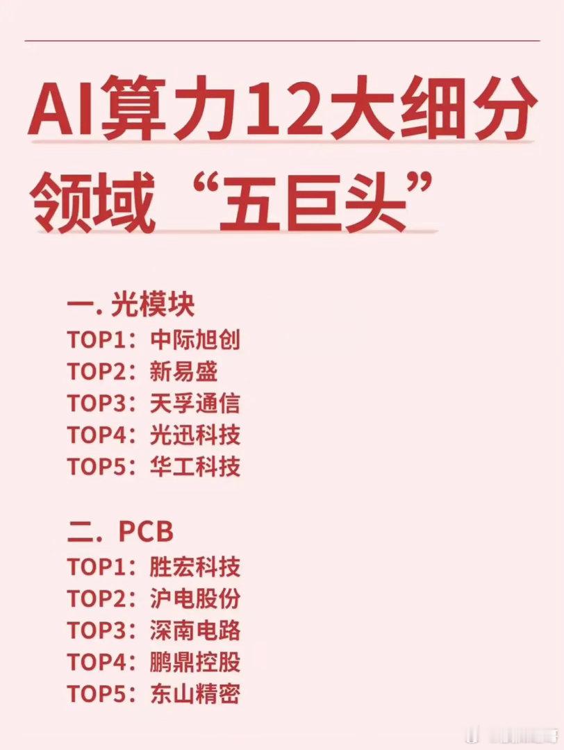 从“堆芯片”到“抢细分”:AI算力的12大赛道,谁才是真正的“定海神针”?2026年的AI算力赛道,早已不是单纯拼“大模型参数”的时代。当推理算力占比首次突破70%,一场从上游硬件到下游应用的“全链条军备竞赛”,正在12大细分领域悄然打响。在这场竞赛里,光模块是当之无愧的“数字血管”。中际旭创、新易盛等龙头早已不是传统模块的玩家,华为发布的单波1.6T硅光模块、光迅科技的3.2T硅光NPO方案,正把中国厂商推向全球高速光通信的技术前沿。硅光技术的渗透率在1.6T模块中已达70%以上,功耗降低40%的同时,也让这些企业在算力传输的“高速公路”上筑起了护城河。而液冷散热则成了决定AI集群生死的“生命线”。随着单机柜功率向兆瓦级迈进,英维克、网宿科技等企业的技术突破,正在改写行业规则。曙光数创发布的MW级相变浸没液冷整机柜,将PUE降至1.04以下,散热效率是传统方案的3-5倍。当AI服务器的液冷渗透率即将突破50%,谁能把“算力的温度”降下来,谁就能吃下未来高密度智算中心的最大蛋糕。从PCB、AI芯片到算力租赁、大模型应用,12大赛道环环相扣,没有一个环节能独善其身。寒武纪、海光信息在国产AI芯片上的持续突破,浪潮信息、工业富联在服务器领域的规模化优势,再到金山办公、科大讯飞在应用端的场景落地,共同编织起一张覆盖全产业链的算力网络。今天的算力竞争,早已不是单点突破就能取胜的游戏。每一个细分领域的龙头,都是产业链上不可或缺的齿轮。当“词元通胀”带来的推理算力需求井喷,这些扎根技术、深耕场景的企业,才是支撑中国AI算力行稳致远的“定海神针”。