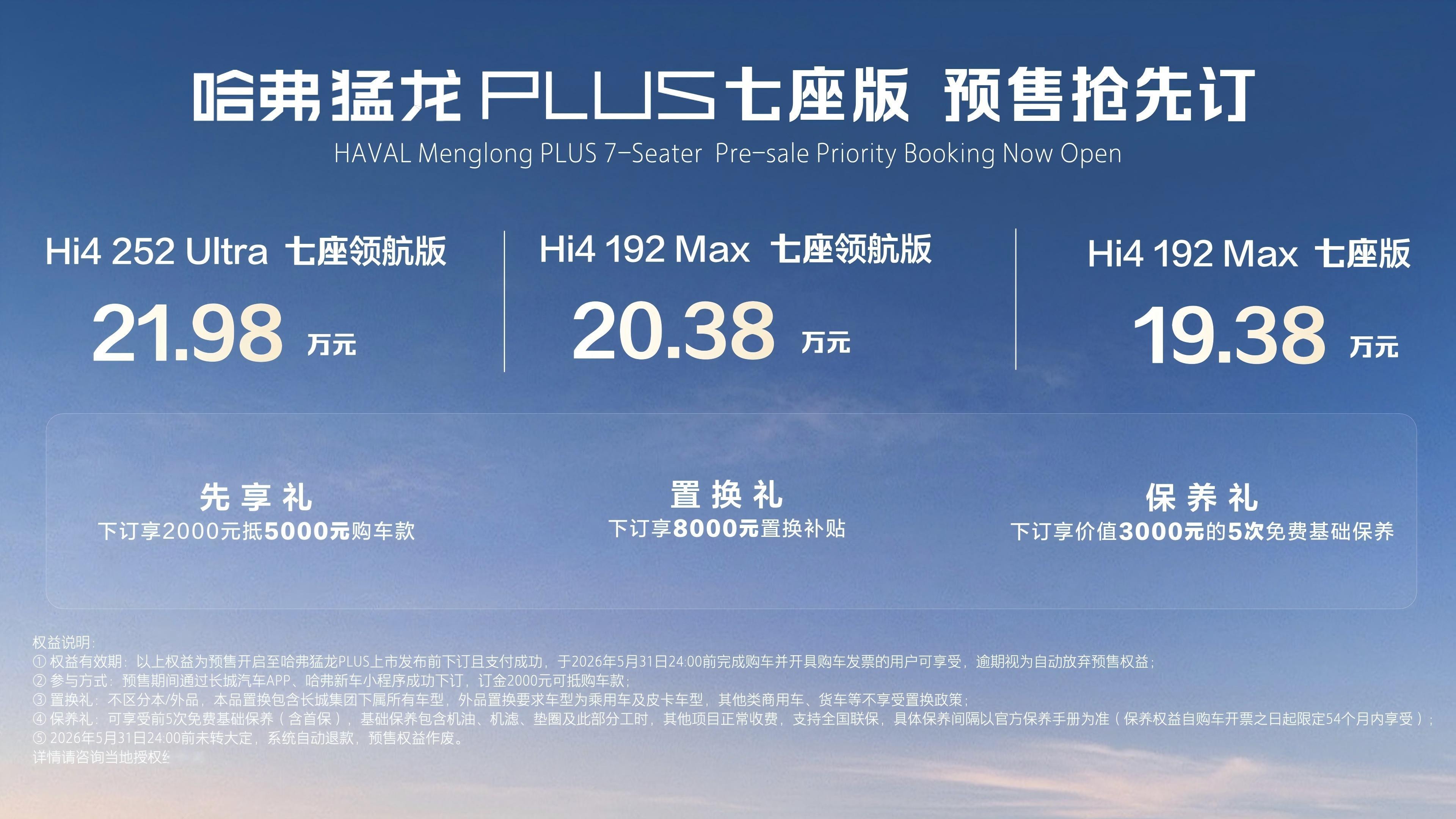 2026北京车展 哈弗猛龙PLUS七座版开启预售,19.38-21.98万元,2+3+2布局,非常实用,全系标配Hi4智能四驱电混技术,哈弗猛龙PLUS五座版CLTC纯电续航255公里,哈弗猛龙PLUS七座版 CLTC纯电续航252公里,综合续航均超1000公里,大空间配置高,方盒子造型非常帅,这是一款全能座驾,我非常推荐。哈弗猛龙plus七座版预售