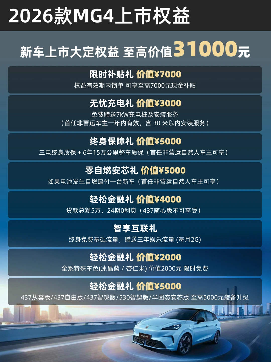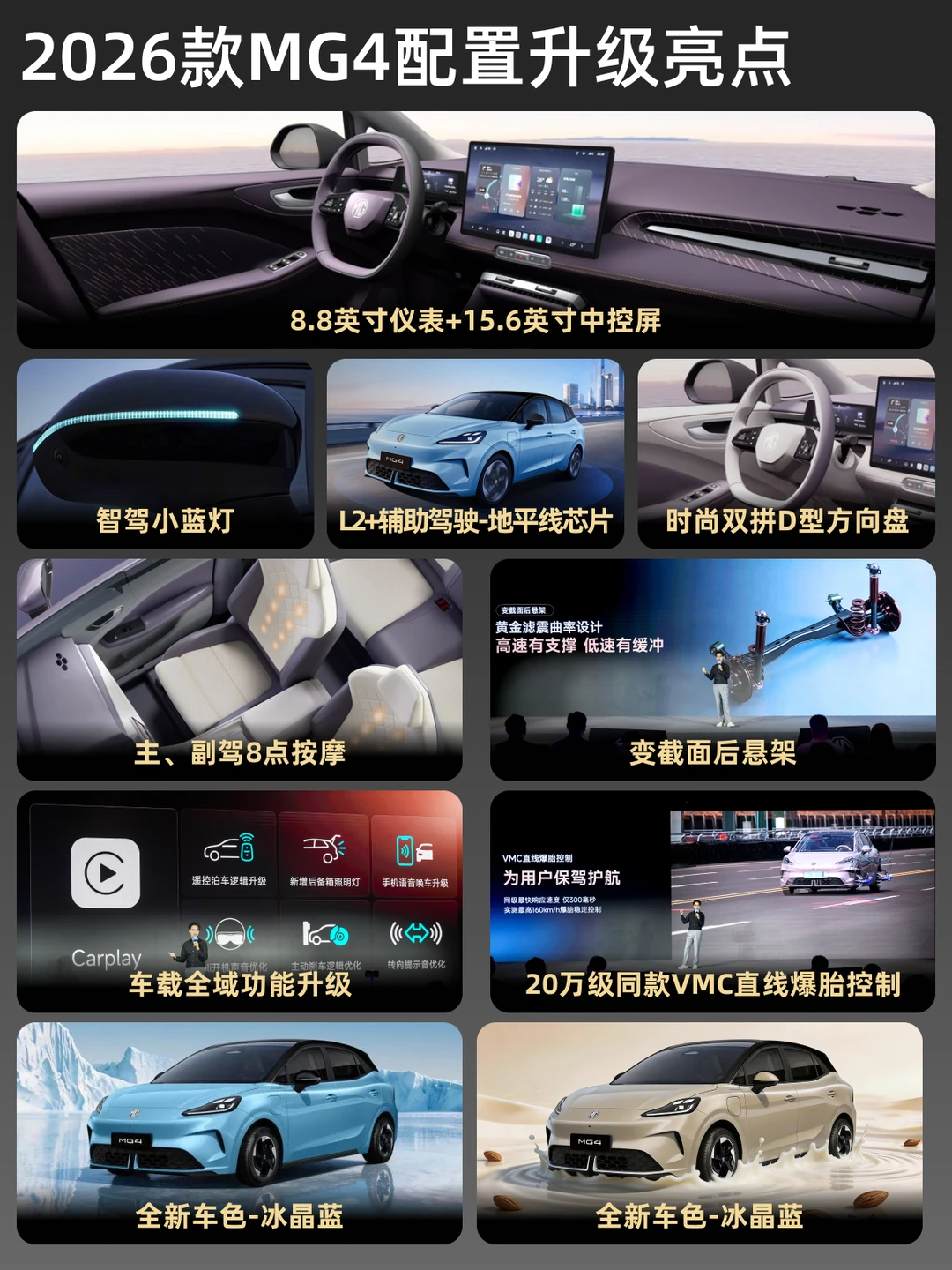 2026款的MG4正式上市了,每个版本都有加量,限时补贴价格区间6.58-9.98万元,437自由版补贴价降1000元,530智趣版补贴价降4000元,直接杀进8万级。8万多就能拥有L2+级智驾,这波我给到夯!作为去年的“精品代步卷王”,这次改款可以说是把你多交的购置税,用智驾、安全、舒适配置全给补上了。