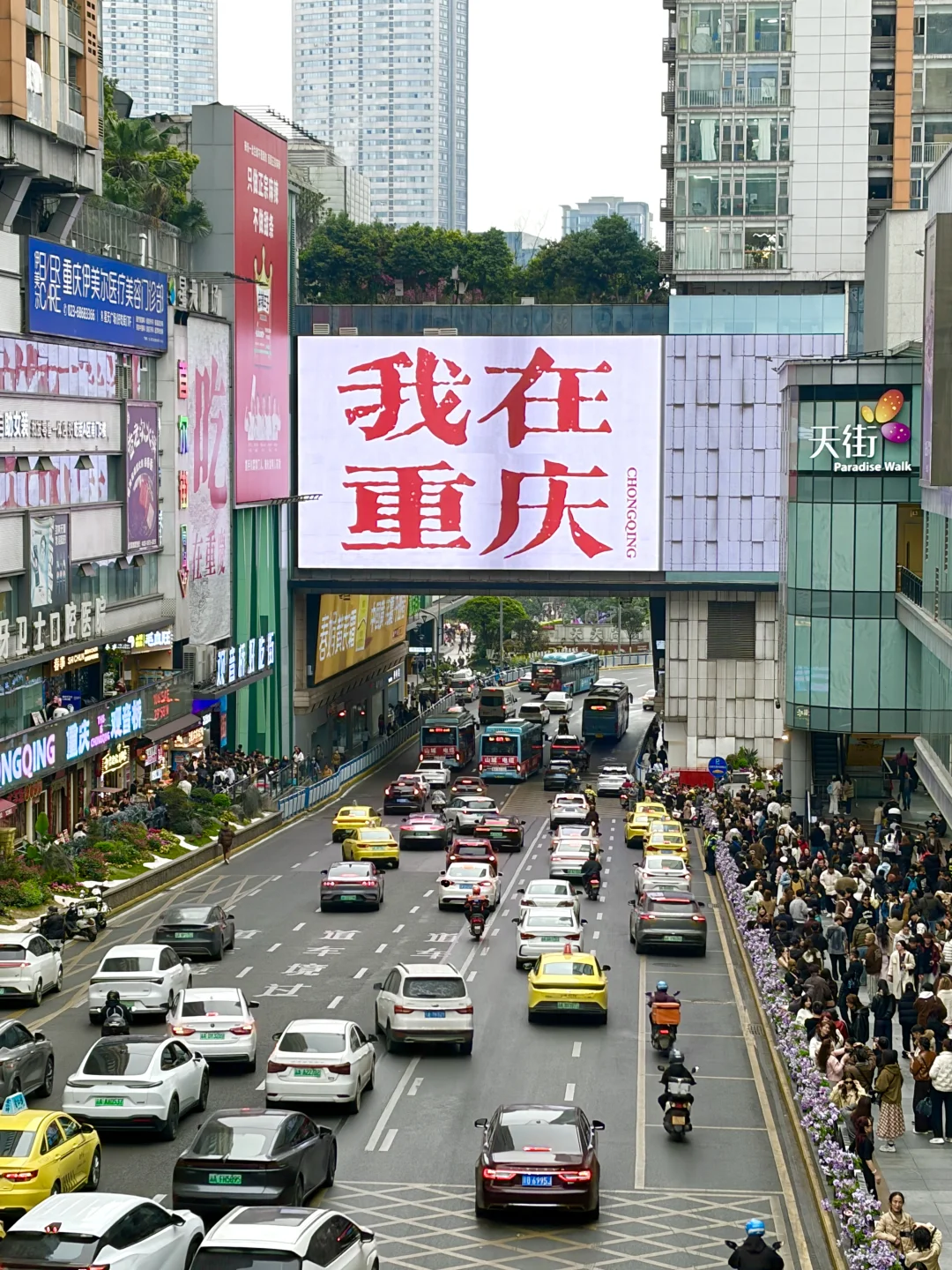 📍“我在重庆”大屏:观音桥北城天街环道,马路两旁和天桥都好拍,晚上在天桥上看车水马龙很有感觉