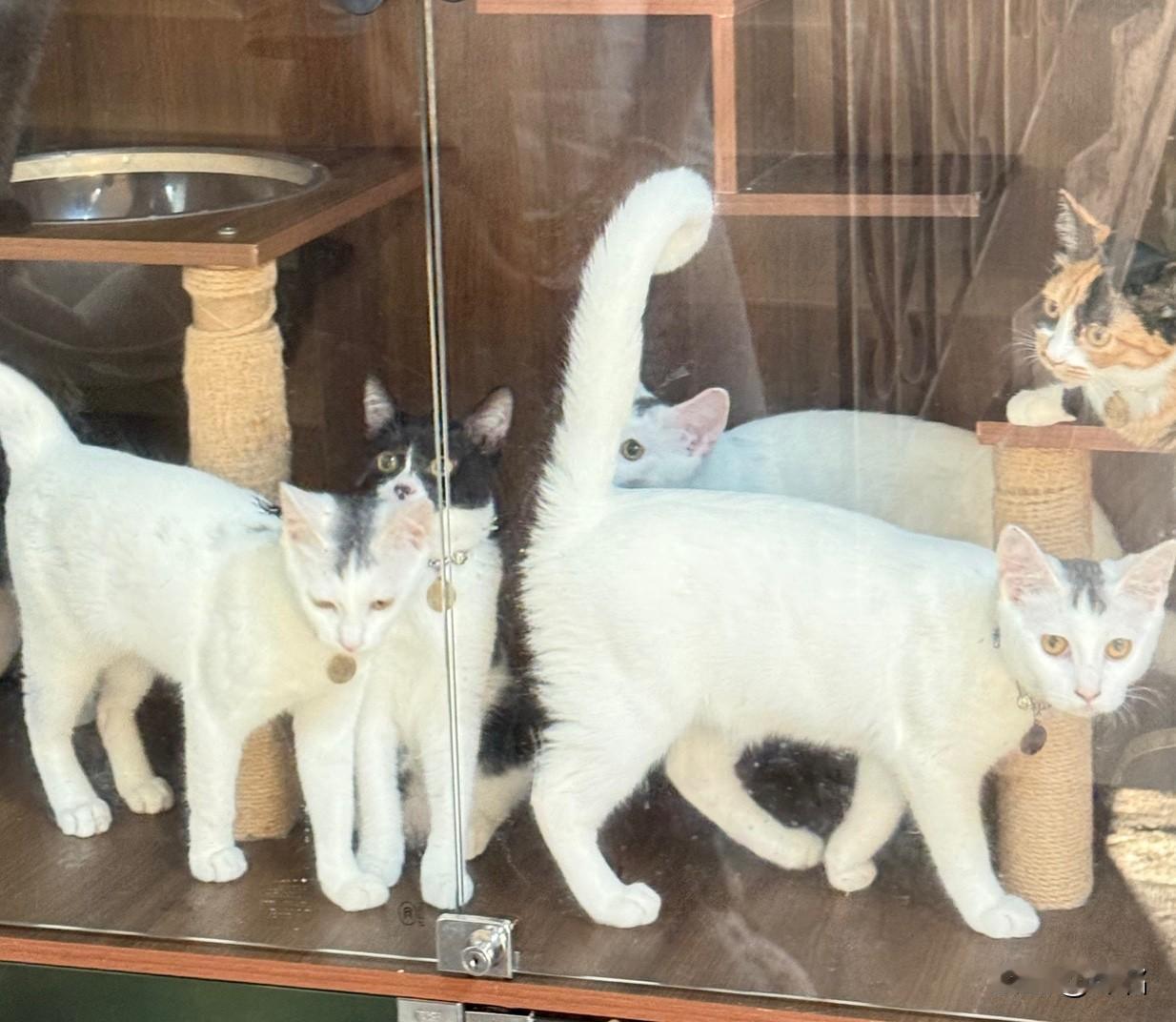 你看中间这张照片,两只纯白猫咪占C位,一只低头温顺,一只竖尾警觉,都戴着金项圈,毛发干净蓬松。黑白奶牛猫藏于两只白猫身后,探出脑袋,看到我在拍照,眼神很好奇看着我。