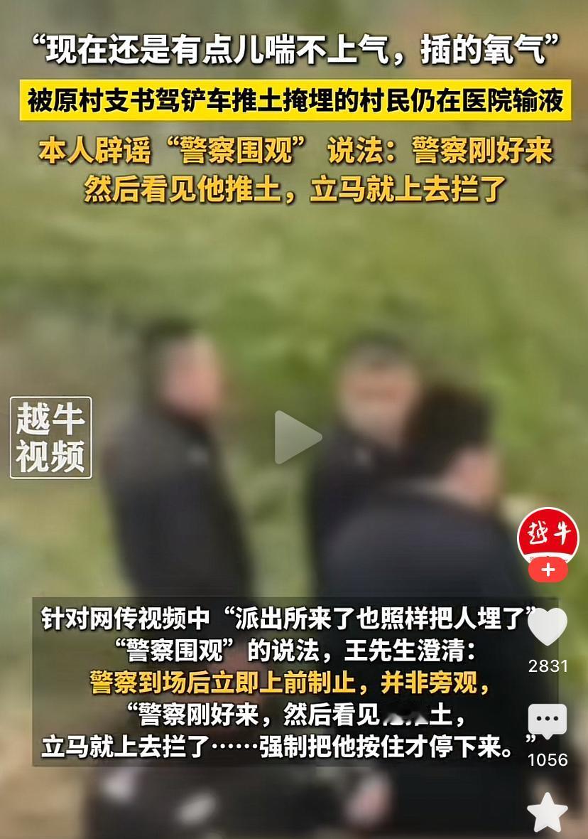 民警在现场为何未及时制止村支书的行为,引发众人质疑。被埋的红衣男子澄清,村支书活埋他时警察刚好赶到现场,及时制止了其行为,民警上前强行将村支书按住,他才停手,大家错怪民警了。