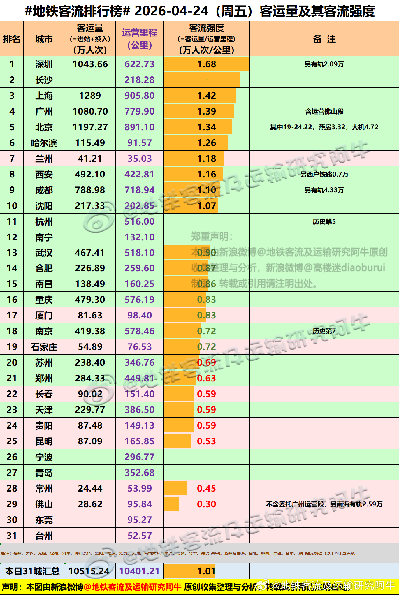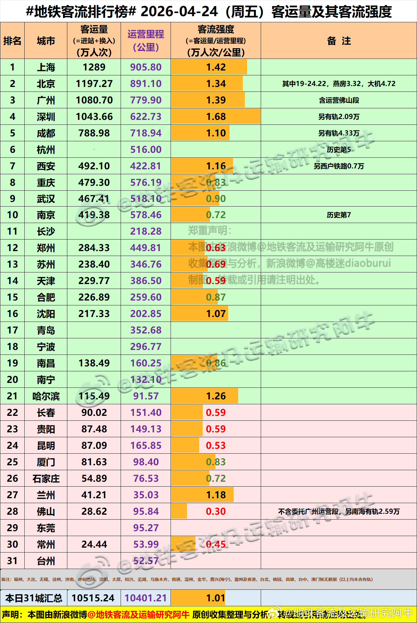 【中国城市地铁客流排行榜 2026-04-24(周五,农历三月初八,中国地铁客流