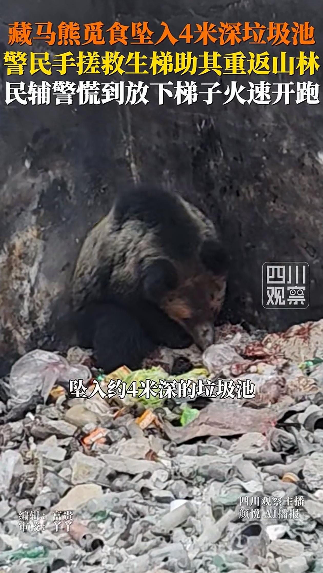 “双方都很紧张!”四川甘孜,一只两百多斤藏马熊,掉进了一个4米多深的垃圾池里了,在底下上不来急得嗷嗷叫,附近的警民一听这动静,赶紧组团来救“熊”。