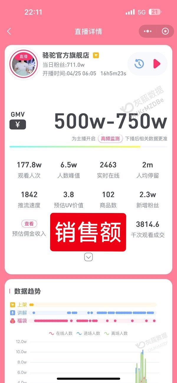 迪丽热巴直播,热度又登顶了,骆驼总销售额在500-750万区间,热巴商业价值挺牛。