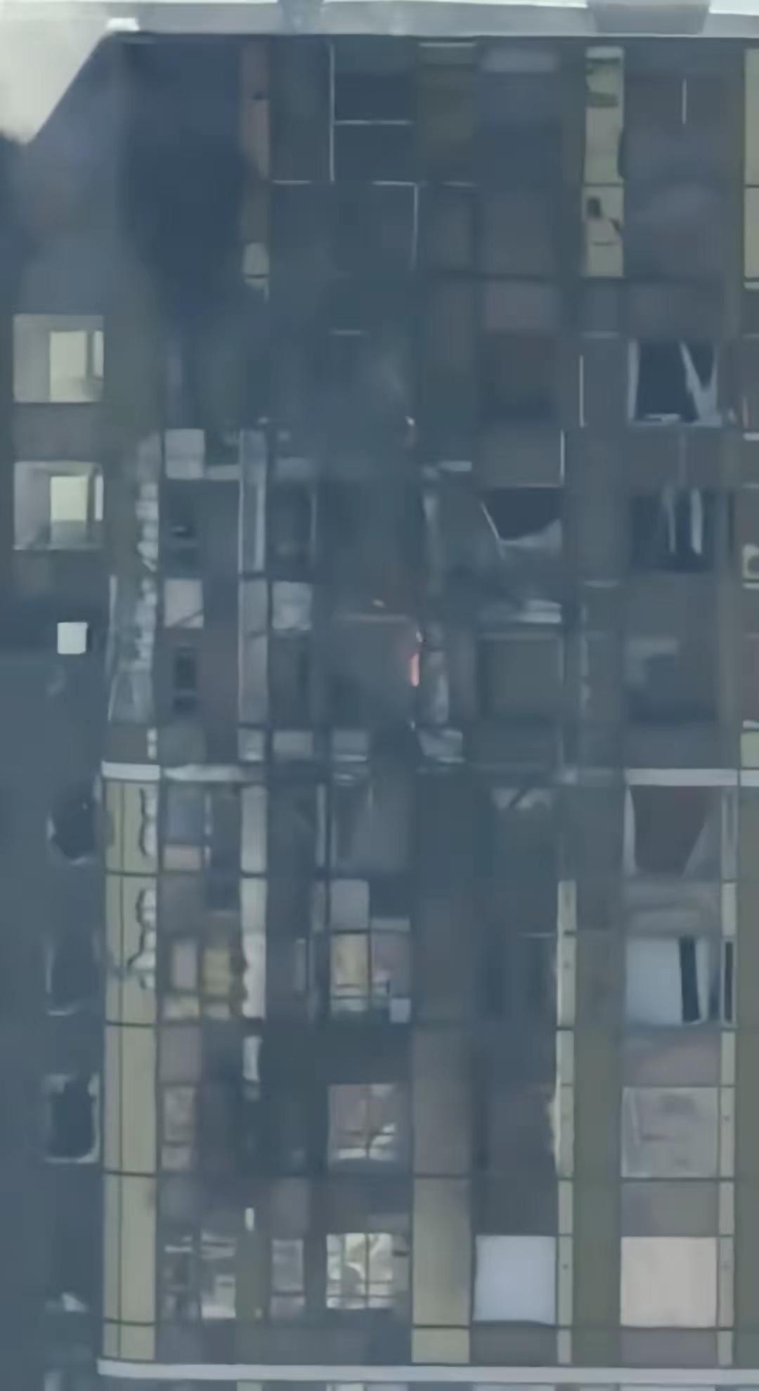 社交媒体 X 上发布并经核实的视频显示,浓烟从一栋现代化高层建筑顶部涌出。大楼的部分外立面被严重熏黑,多扇窗户被震碎。