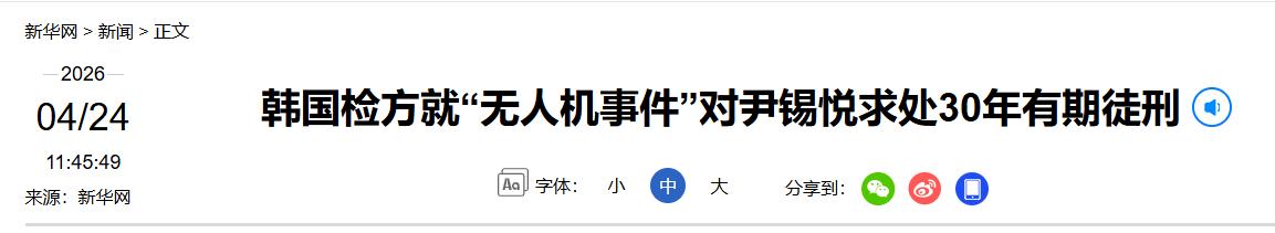 4月24日,韩国检方对前总统尹锡悦提出30年有期徒刑量刑建议,指控其人为制造紧张局势,企图以“无人机入侵朝鲜”事件为借口实施紧急戒严,震惊全国。