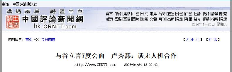 4月24日,台中市长卢秀燕受访时说:昨天与谷立言特别聊到无人机产业,美国是很大的买方市场,我们则是卖方,大家互补与合作,共同发展下一个以台中为领航的台湾护国神山产业。