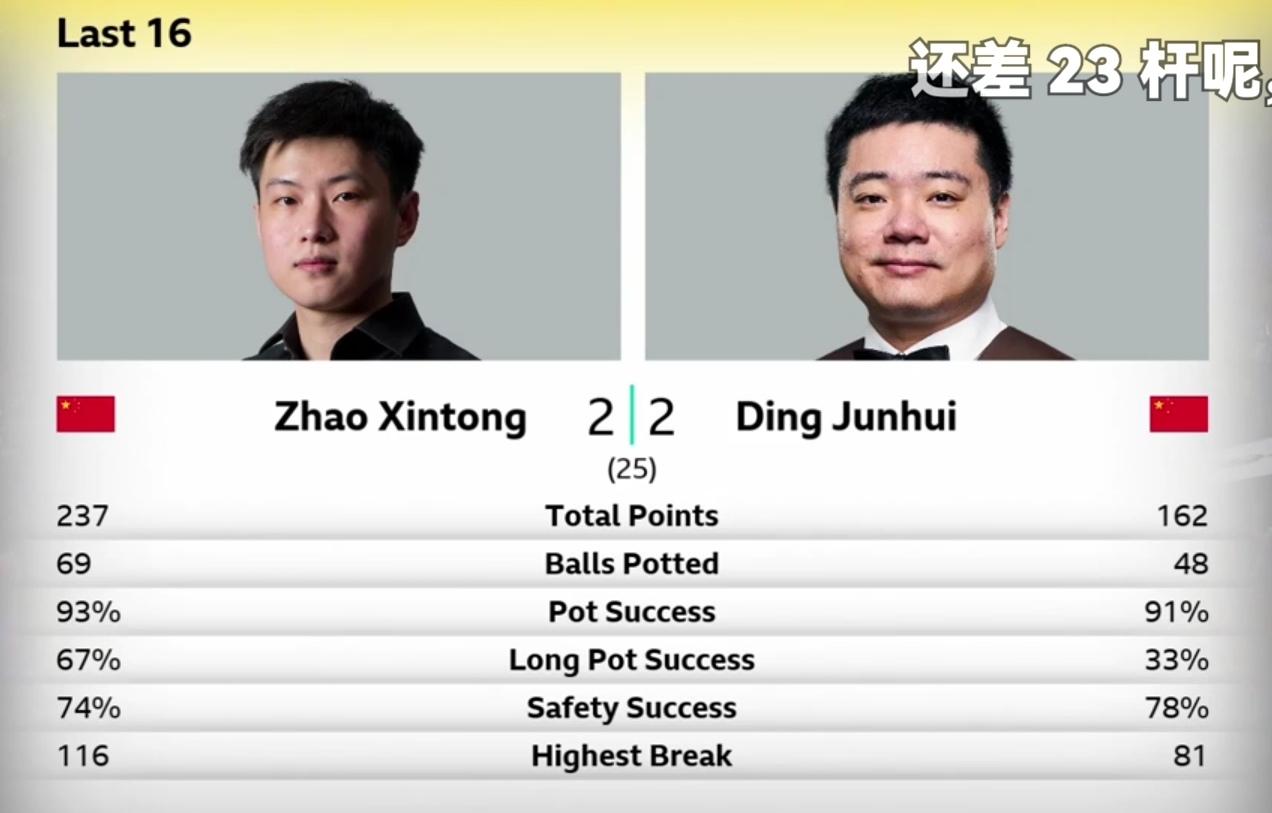 第一阶段前四局赵心童轰出一杆破百、打出一杆50+;丁俊晖打出两杆50+,双方战成2-2平。