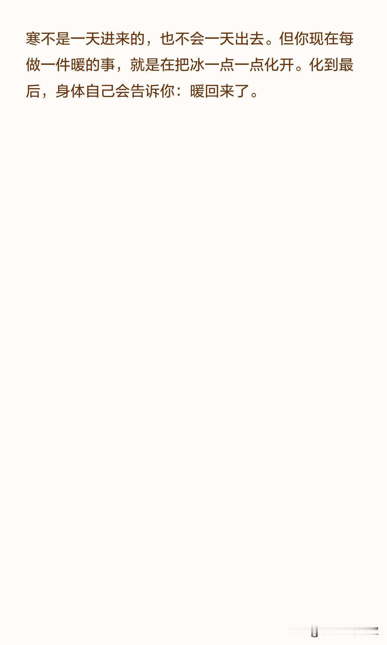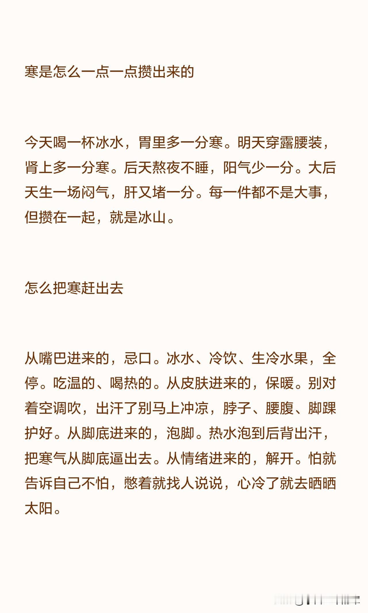 寒气不是一天进来的,也不会一天出去,但每做一件暖的事,都是在把身体里的冰慢慢化开,坚持下去,身体会告诉你:暖回来了。