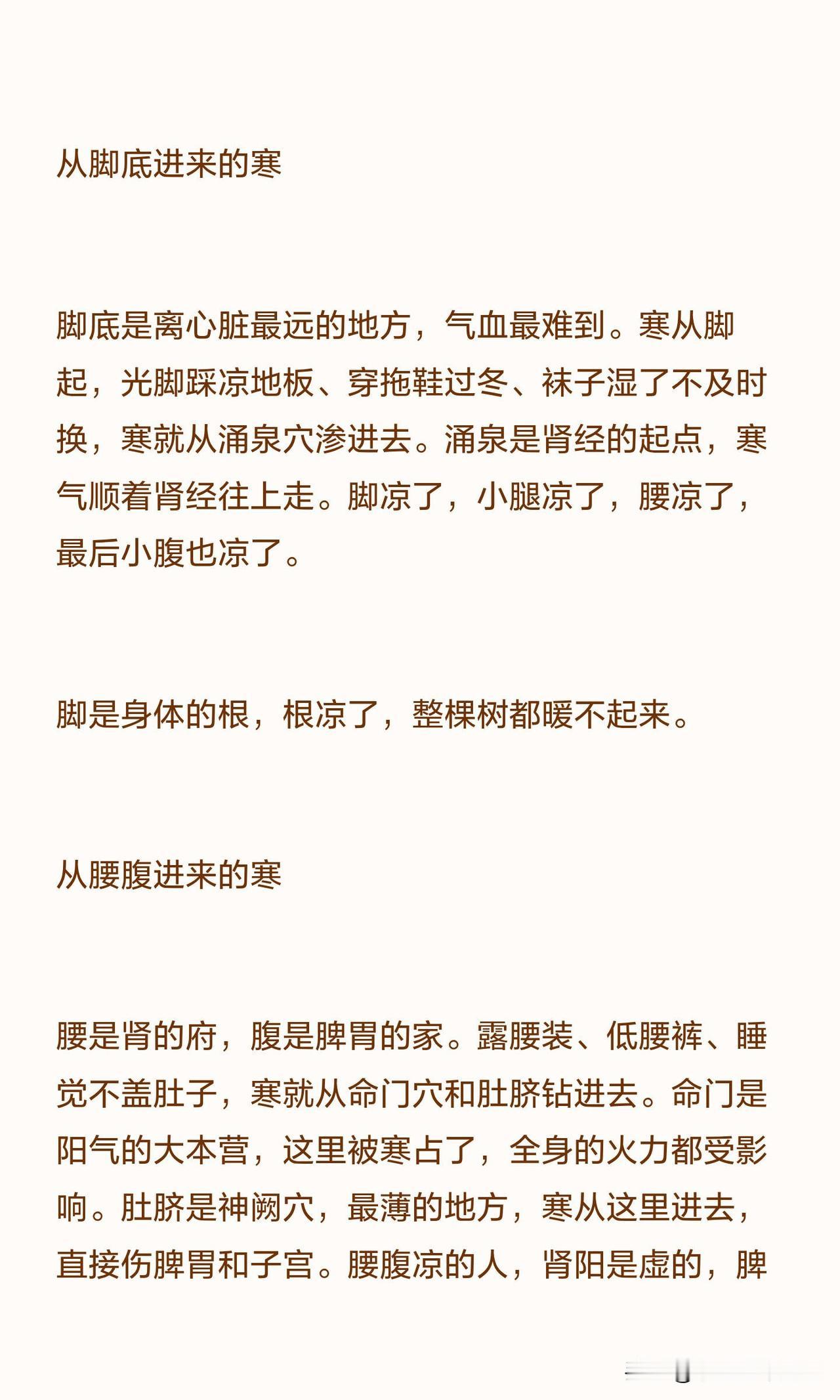 脚是离心脏最远的地方,气血最难到达,也是寒气最容易入侵的通道。光脚踩凉地板、穿拖鞋过冬、袜子湿了不及时换,寒气会从涌泉穴顺着肾经往上走,先让脚凉、小腿凉,再到腰凉、小腹凉。脚是身体的根,根凉了,整个人都暖不起来。