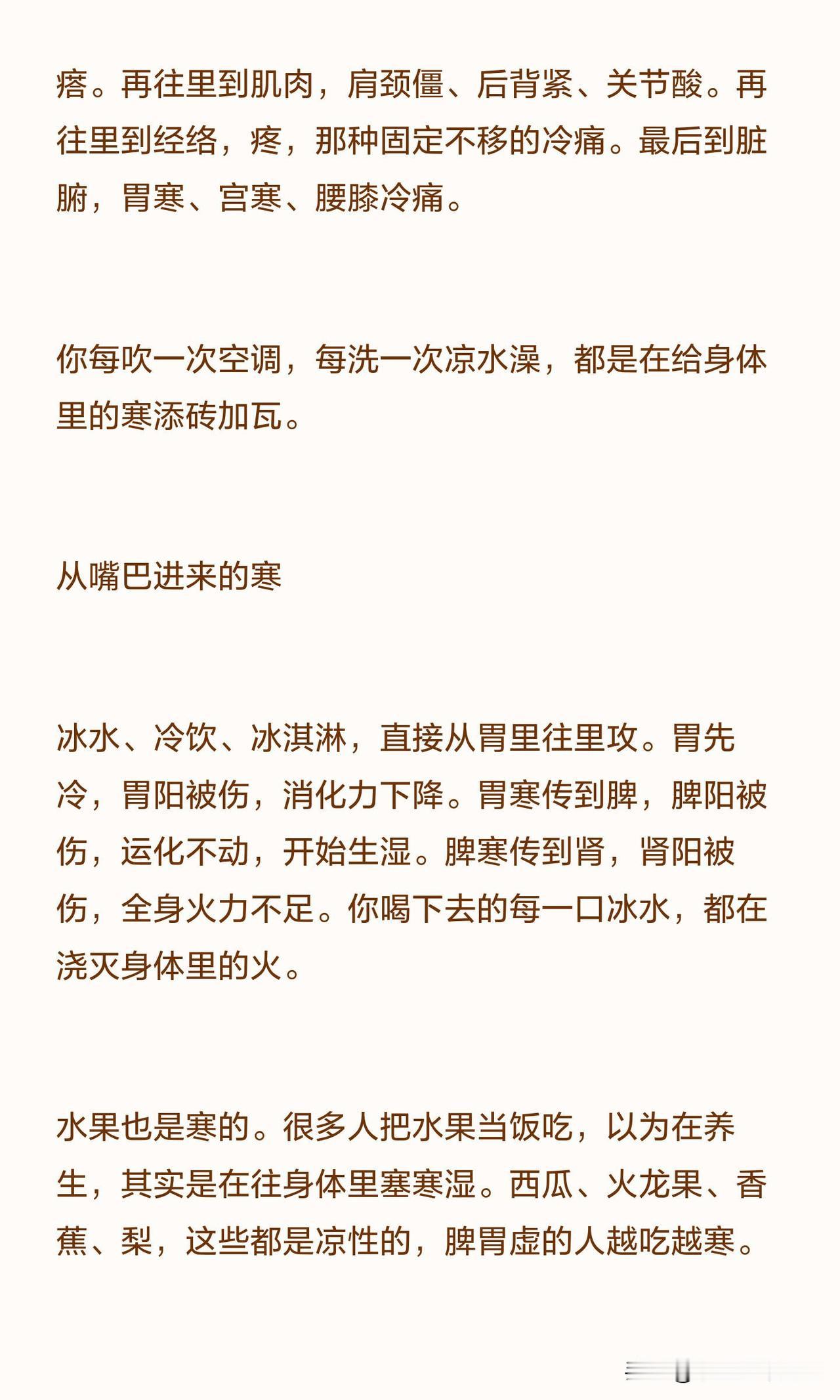 常喝冰水、冷饮、冰淇淋,直接从胃里攻击阳气,胃阳受损后消化力下降,接着影响脾阳、肾阳,让全身火力不足。把西瓜、火龙果、香蕉、梨这类凉性水果当饭吃,脾胃虚弱的人只会越吃越寒。