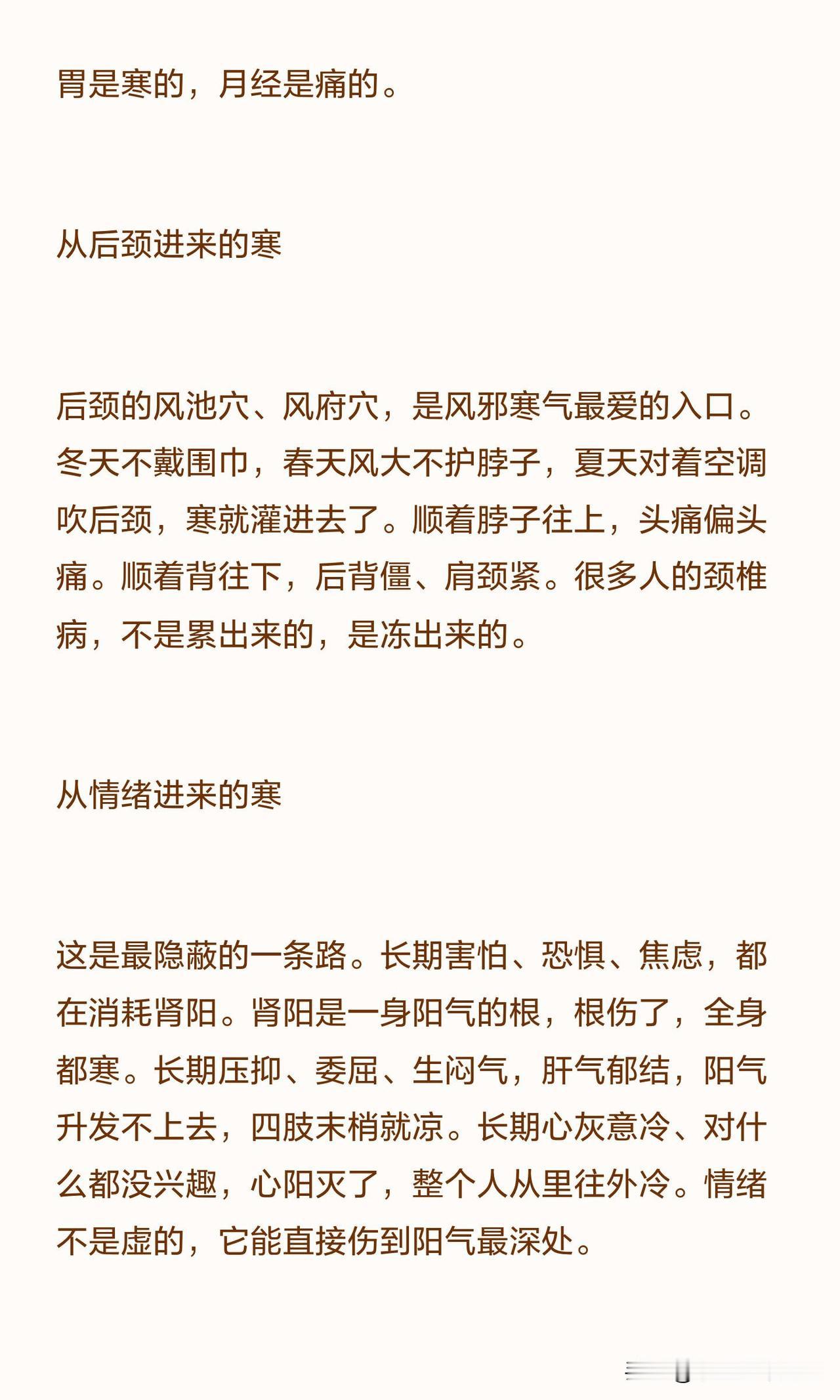 后颈的风池穴、风府穴是寒气最爱入侵的地方。冬天不戴围巾、春天风大不护脖子、夏天对着空调吹后颈,寒气会顺着脖子往上引发头痛,往下导致后背僵硬、肩颈发紧,很多颈椎病其实都是冻出来的。