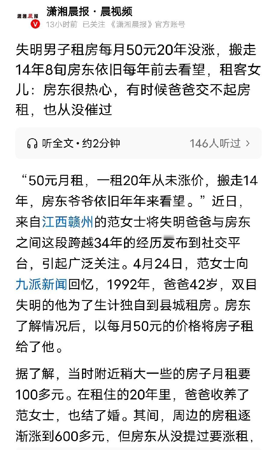 他没因为范先生看不见、生活难就趁火打劫涨房租,反而用50块的月租,给了父女俩一个遮风挡雨的家;也没因为他们搬走了就断了联系,反而用十几年的坚持,把租客当成了亲人。