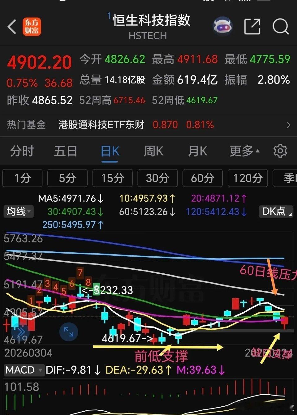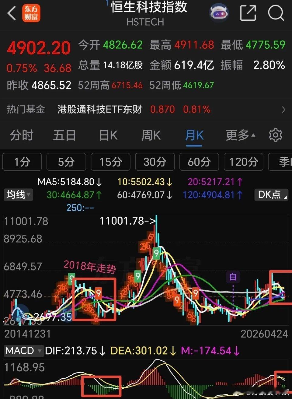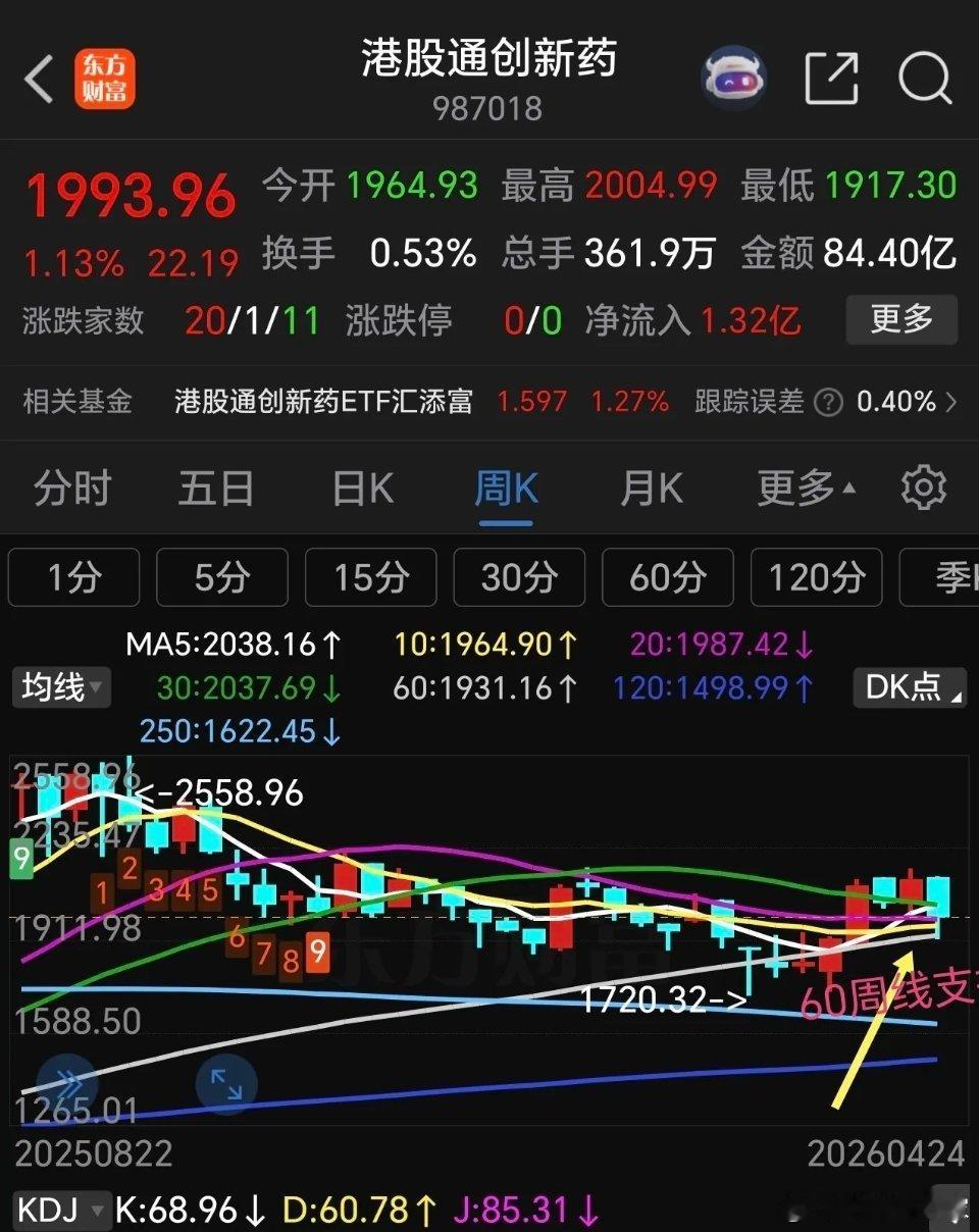 港股通创新药 恒生科技下周走势分析。恒生科技指数前面反弹力度比较弱,连60日线压力位都没有触及就开始回调,目前已经跌破了多条均线支撑,下周5日线开始死叉10日线,周五回补了部分缺口,由于周五美科技板块全面反弹,下周一恒生科技指数有可能高开,如能高开高走,化解5日线死叉10日线趋势,否则,高开低走,就要回补下方缺口,然后继续探底。从它的月线走势来看,月线也是处于下跌趋势,连续下跌6个月了,目前30月线占时获得支撑,假如失守30月线支撑,后期将继续探底,甚至会复制2018年行情(方框内走势),但愿不会这样走,否则26年都没有好日子过。 港股通创新药,港股通创新药表现也是不及预期,反弹到压力区域就回头下跌,已经连续下跌一周。本周五守住了60日线支撑,但是,5日线已经死叉10日线,macd刚刚死叉,短线回调没有结束。假如在60日线支撑止跌反弹,有可能继续挑战前面高点,否则会继续下探。 港股通创新药已经跌破了5 周线支撑,但是守住了60周线支撑,大趋势还没有破坏。不过这个位置不能再继续下跌,否则真的会回踩前面低点,空间有点大! 整个港市几大指数表现都比较弱,不放量拉升很难走出泥潭。