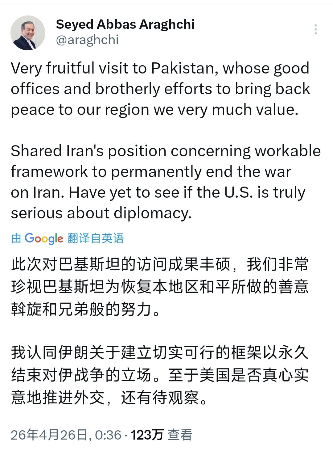 伊朗外长阿拉格齐今天(北京时间4月26日)发文写道:“此次对巴基斯坦的访问成果丰硕,我们非常珍视巴基斯坦为恢复本地区和平所做的善意斡旋和兄弟般的努力。