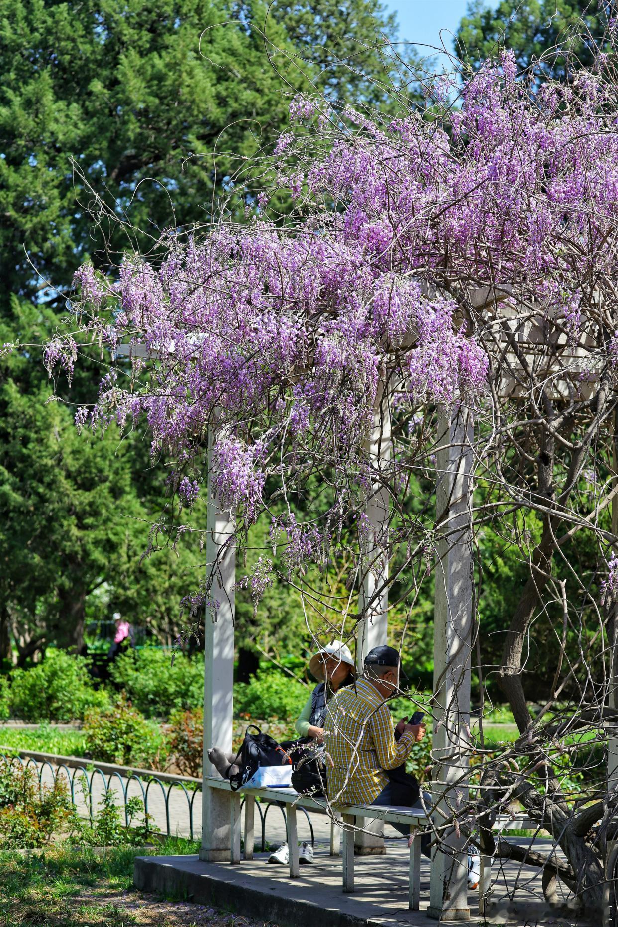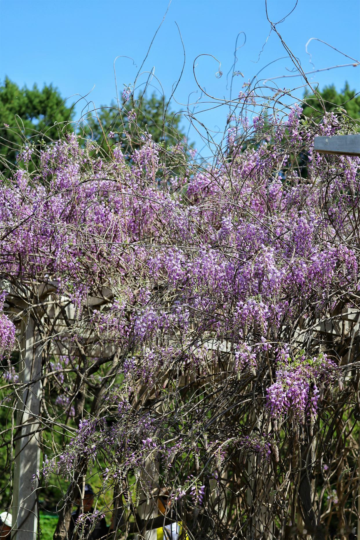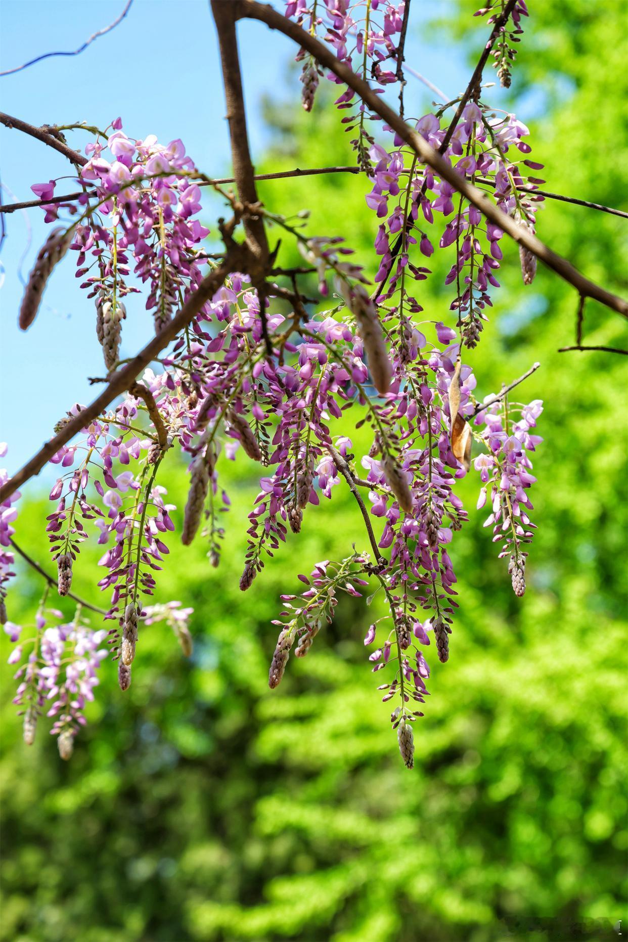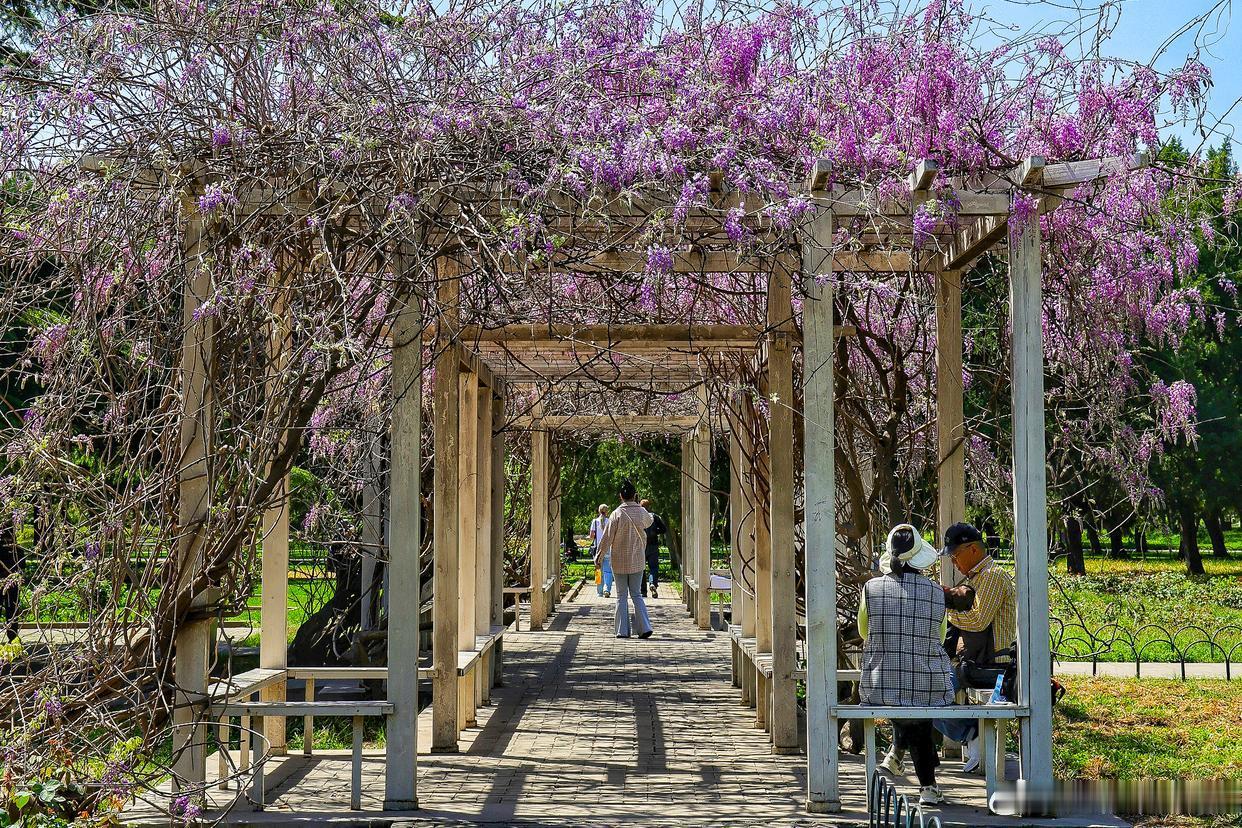 公园紫藤盛放,花穗如紫雾垂悬,随风摇曳~