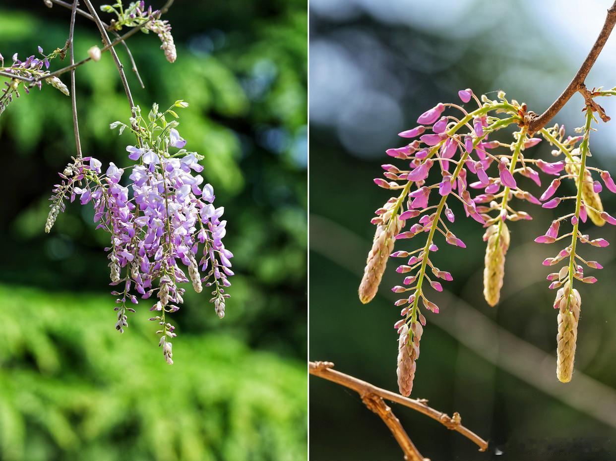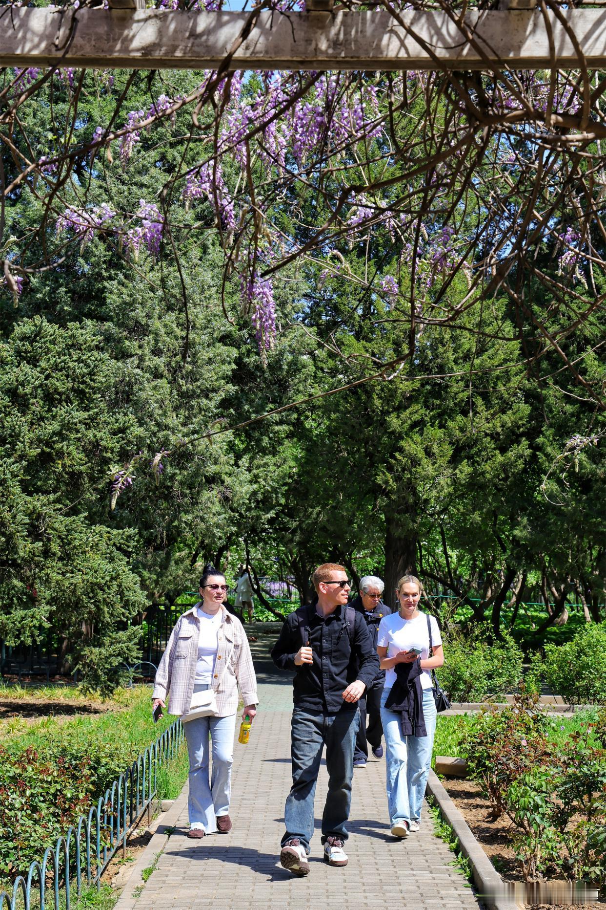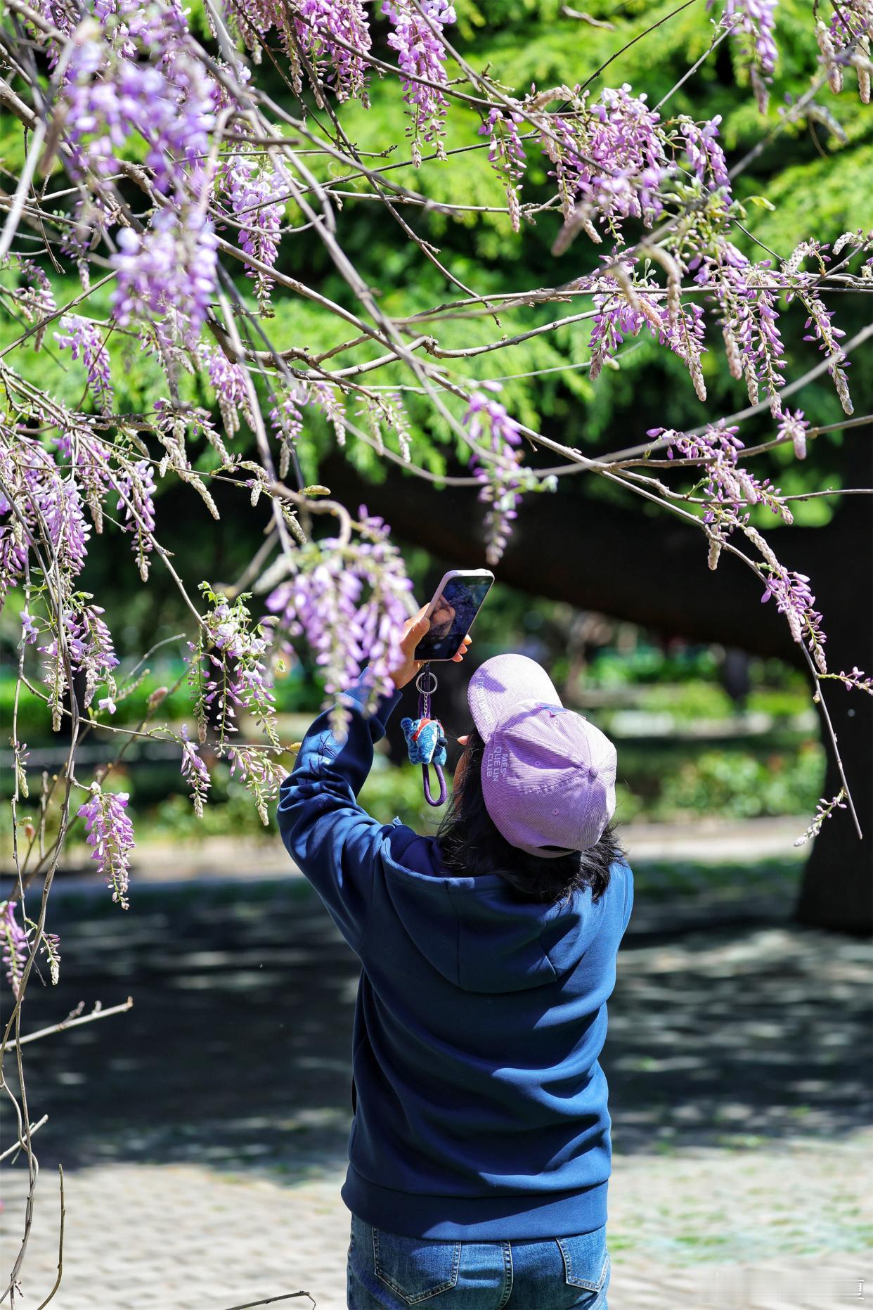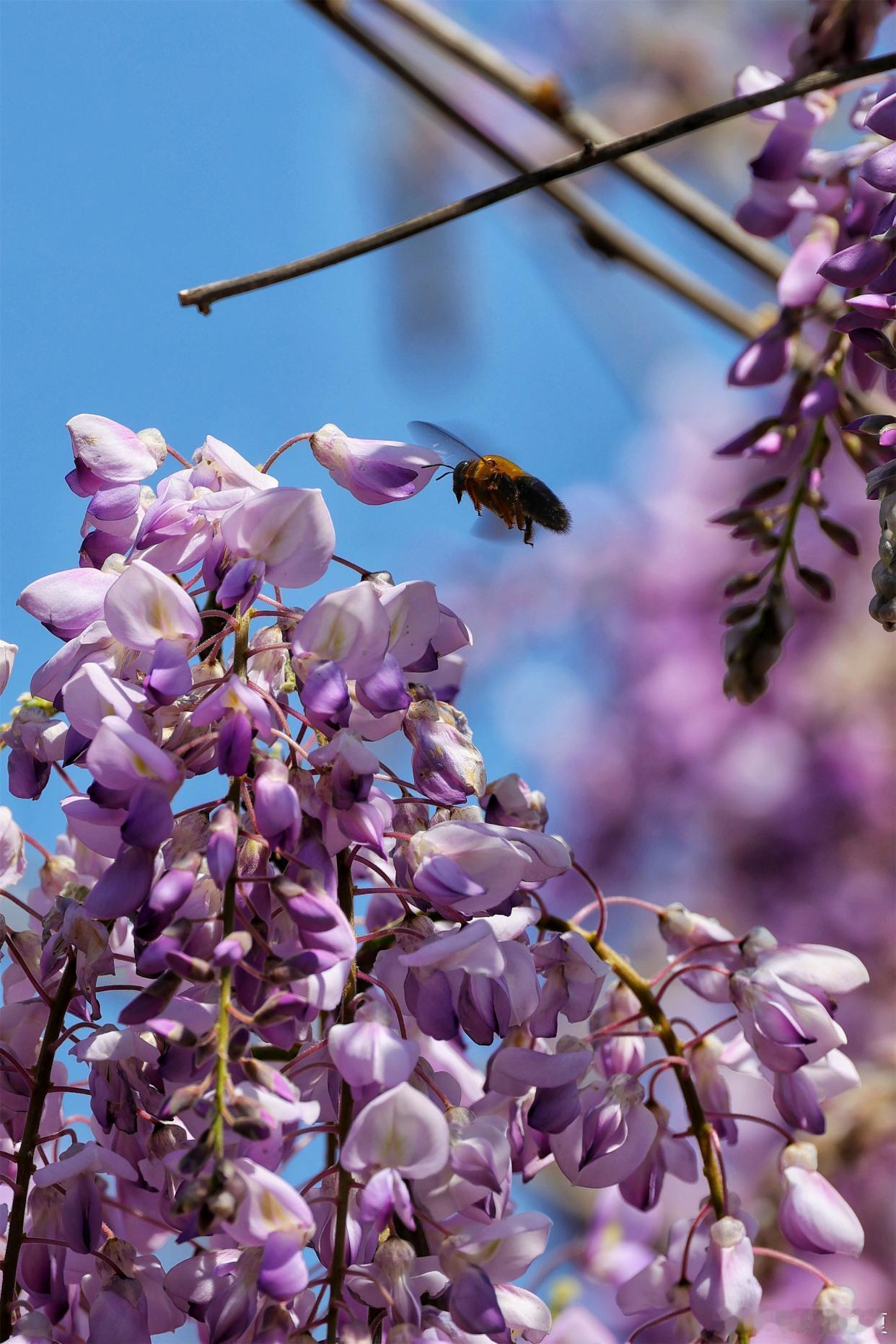 公园紫藤盛放,花穗如紫雾垂悬,随风摇曳~