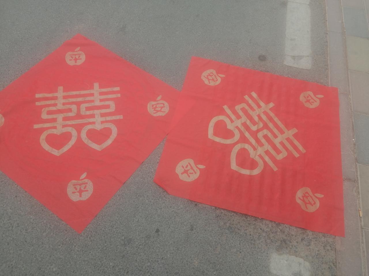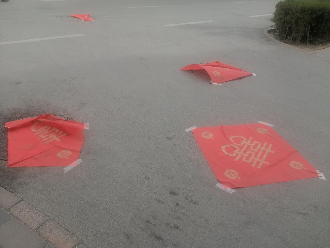 结婚之日,用红纸或红布覆盖新郎、新娘家门前及婚车通过的小区道路下水道井盖。你们那