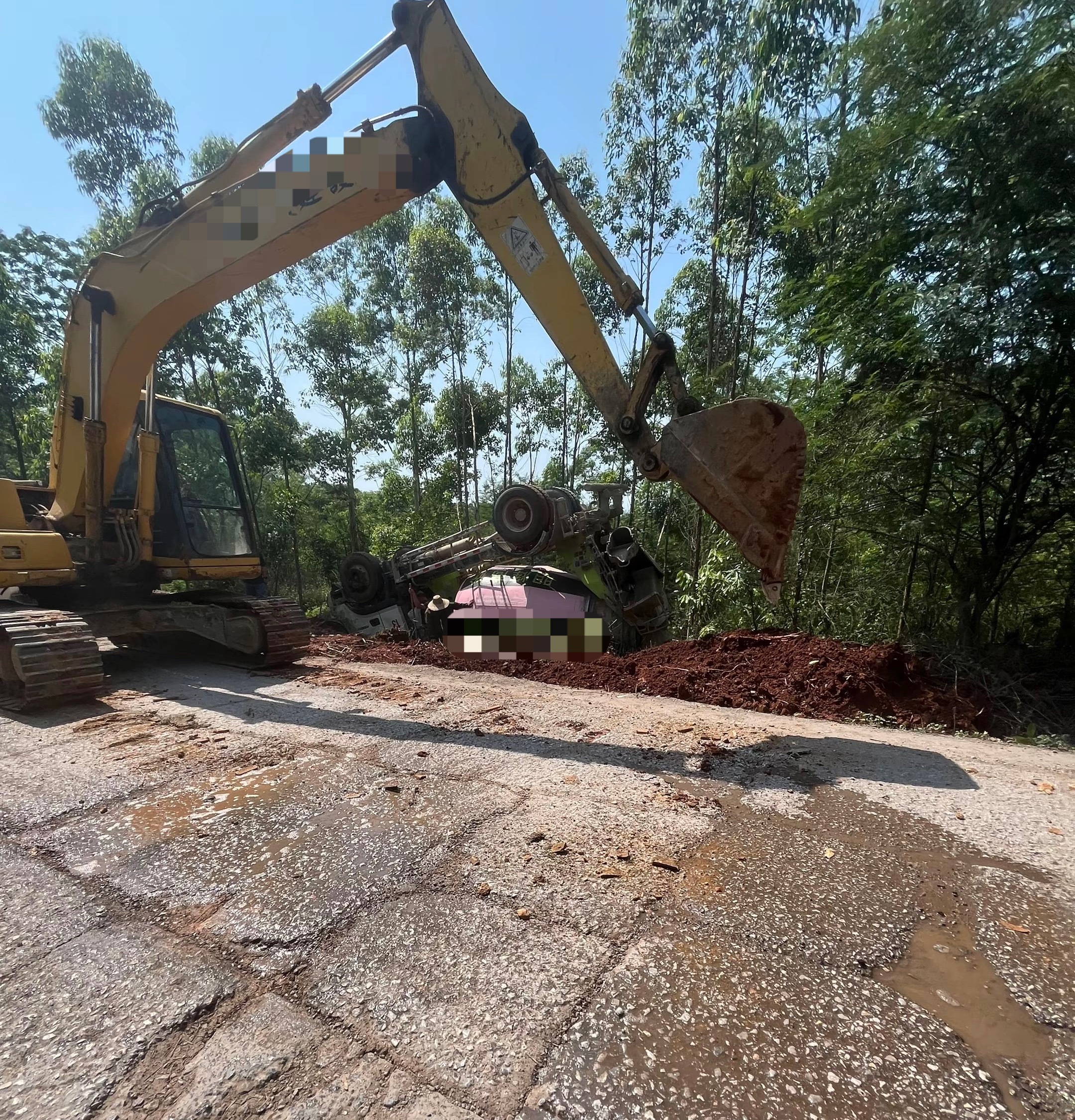 4月25日,广西钦州下某江一辆水泥搅拌车翻车朝天在路边!后来来了一辆挖机在处理!