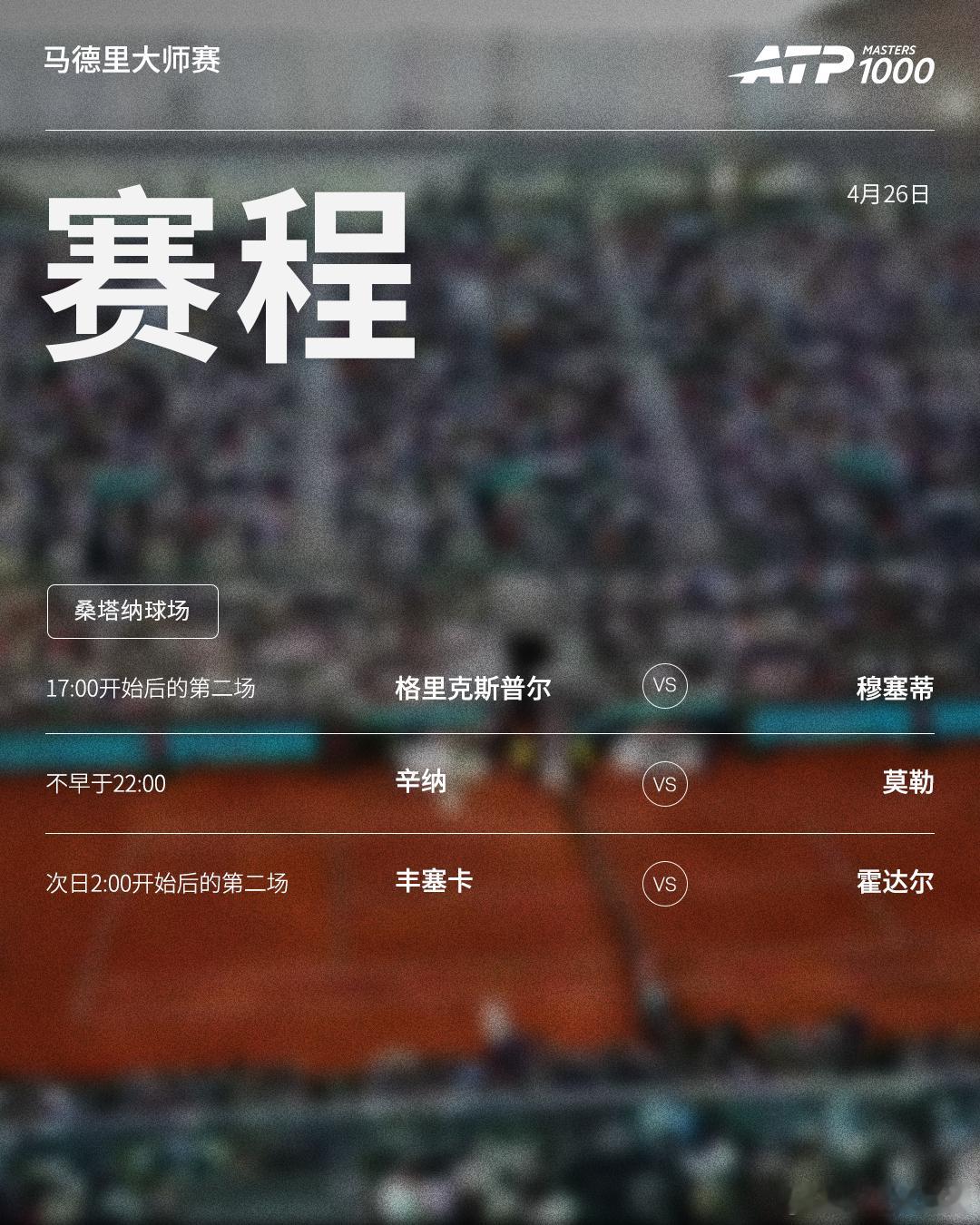 ATP1000 马德里大师赛周日赛程如下(均为北京时间)👀