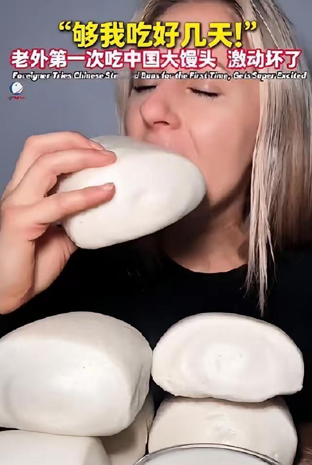 相关视频里,金发碧眼的老外对着镜头花式解锁馒头的吃法,点赞量动辄几十万。