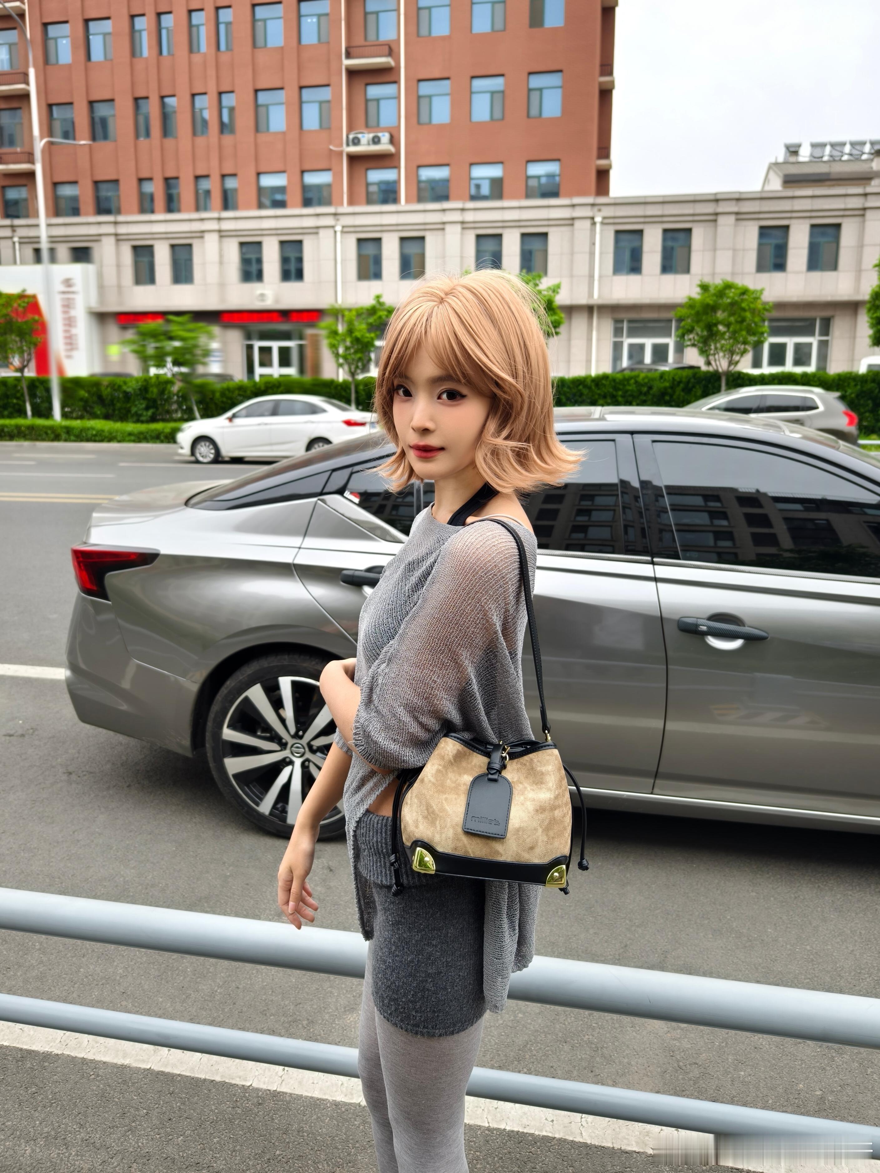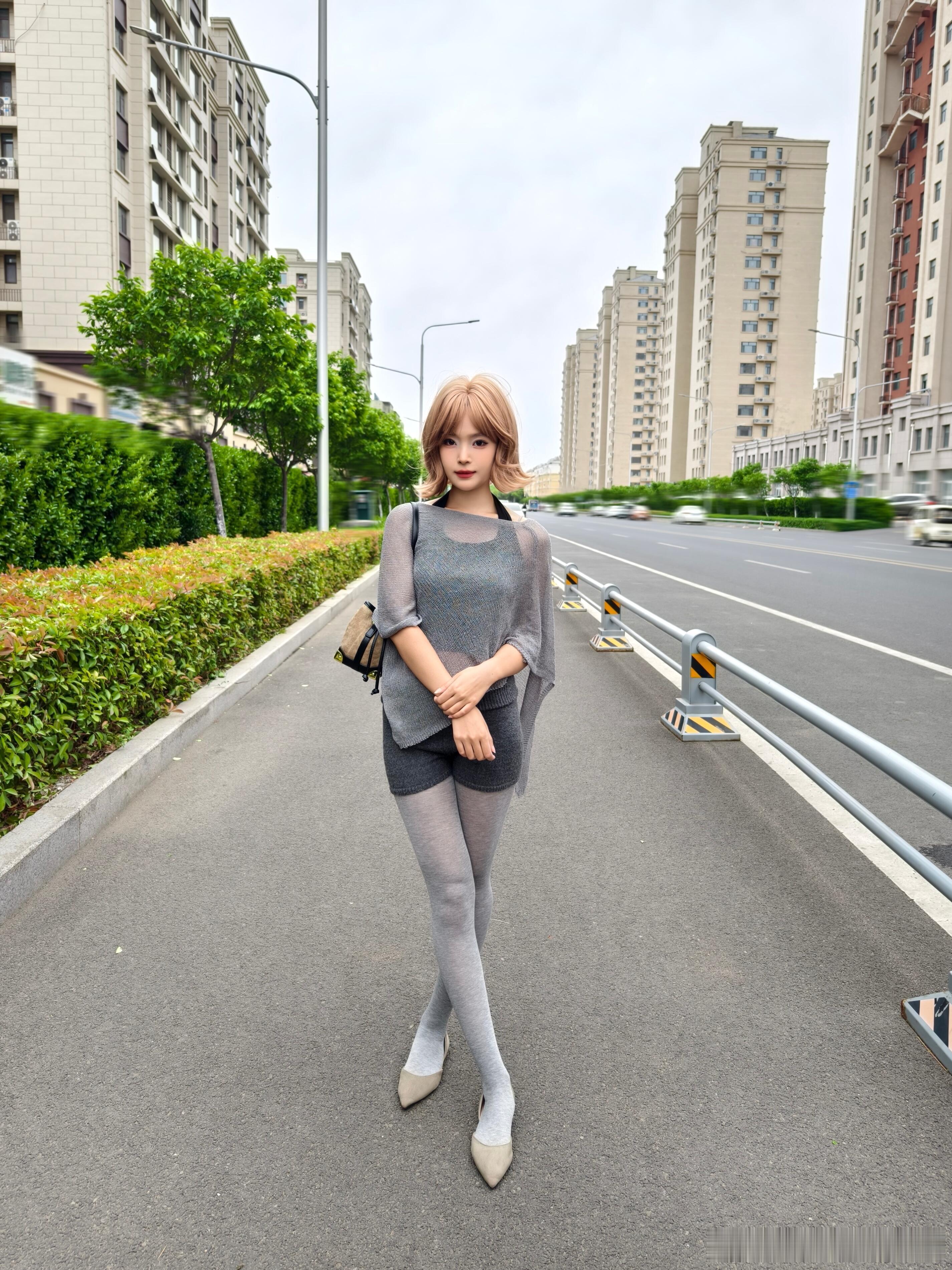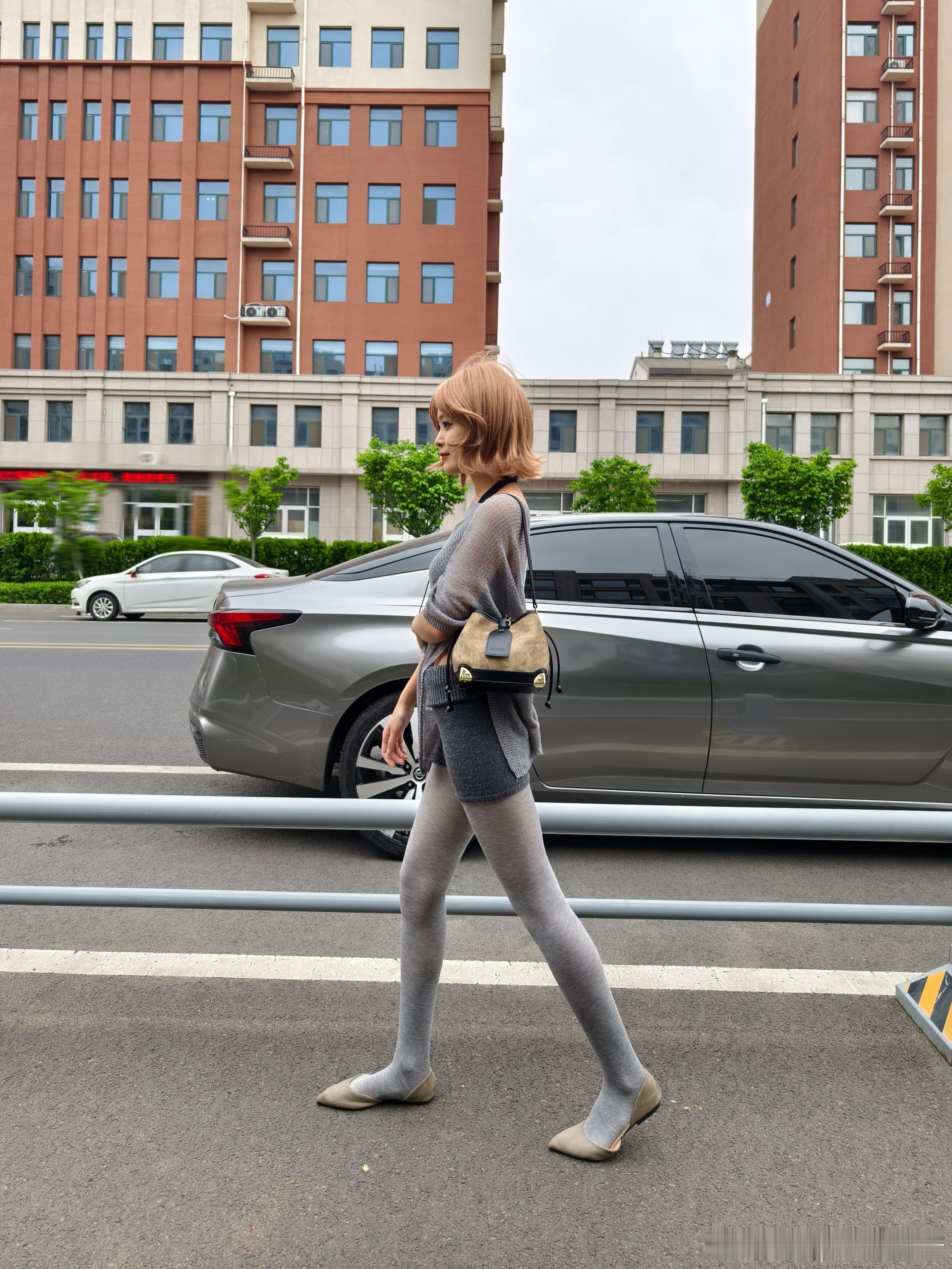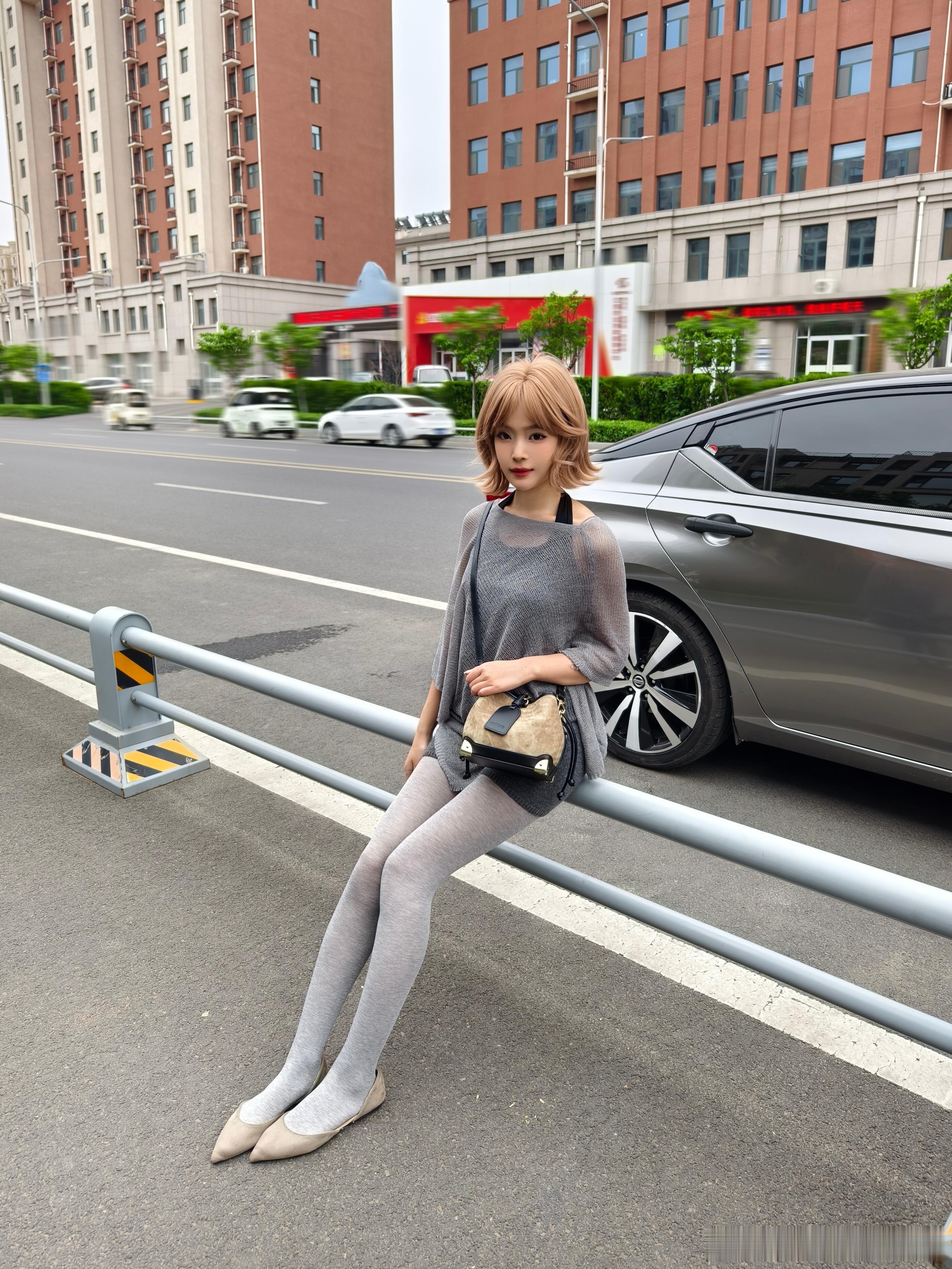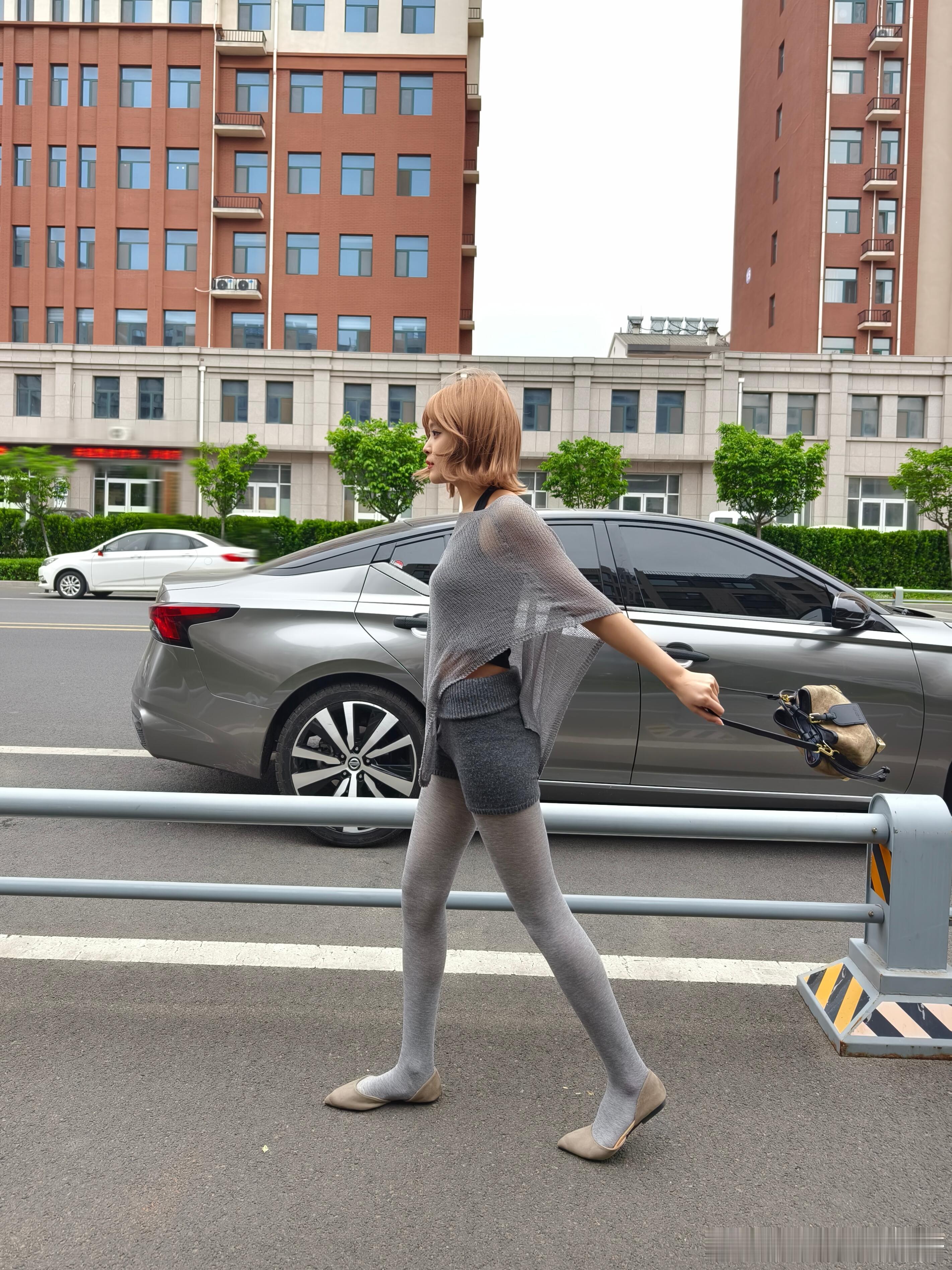 灰衫黑裙,丝袜衬高跟,停车场里,优雅自成风景。