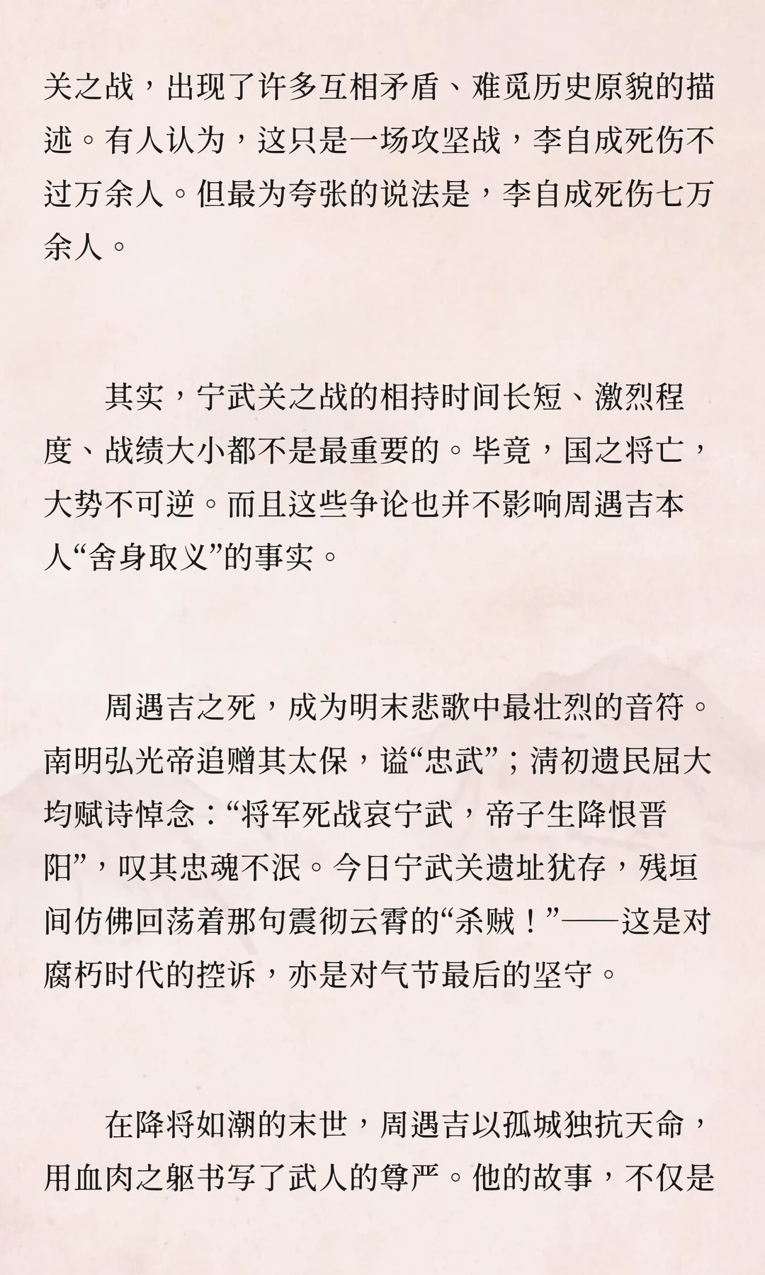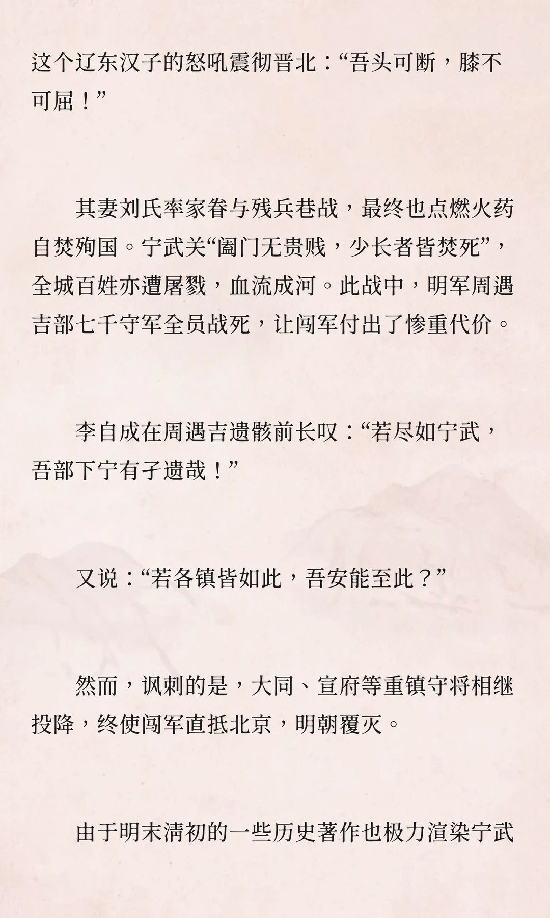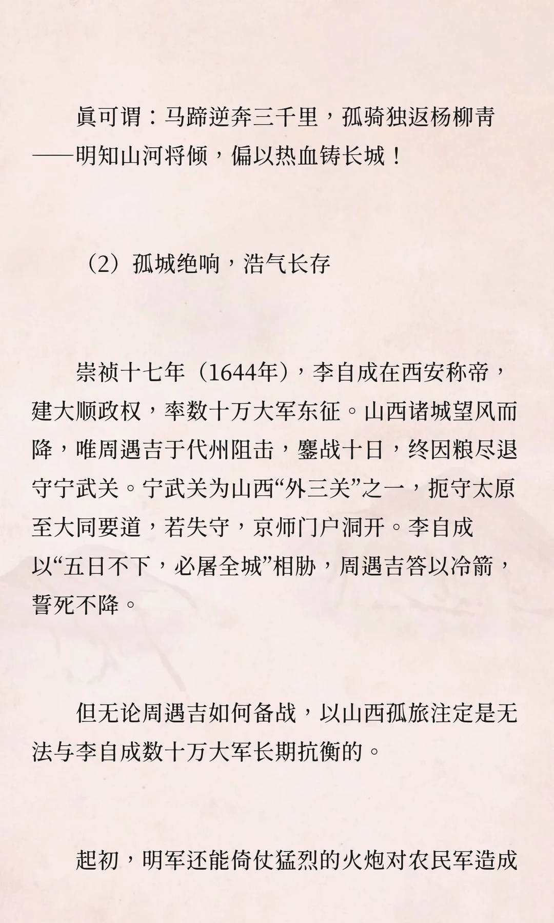 李自成攻占山西时,宁武关守将周遇吉坚守孤城,与数十万闯军激战十日,最终被俘后英勇就义。他的忠义之举成为明末悲歌中最壮烈的音符,展现了武人的尊严。