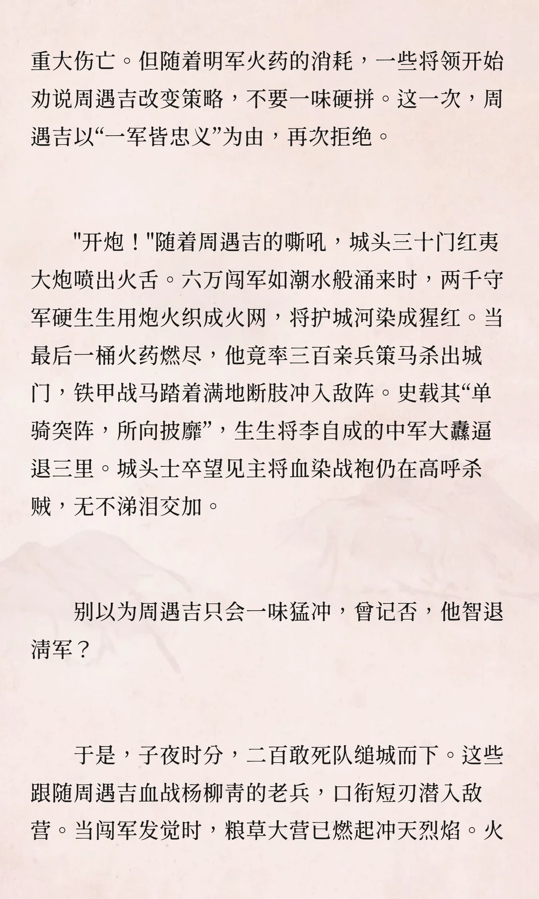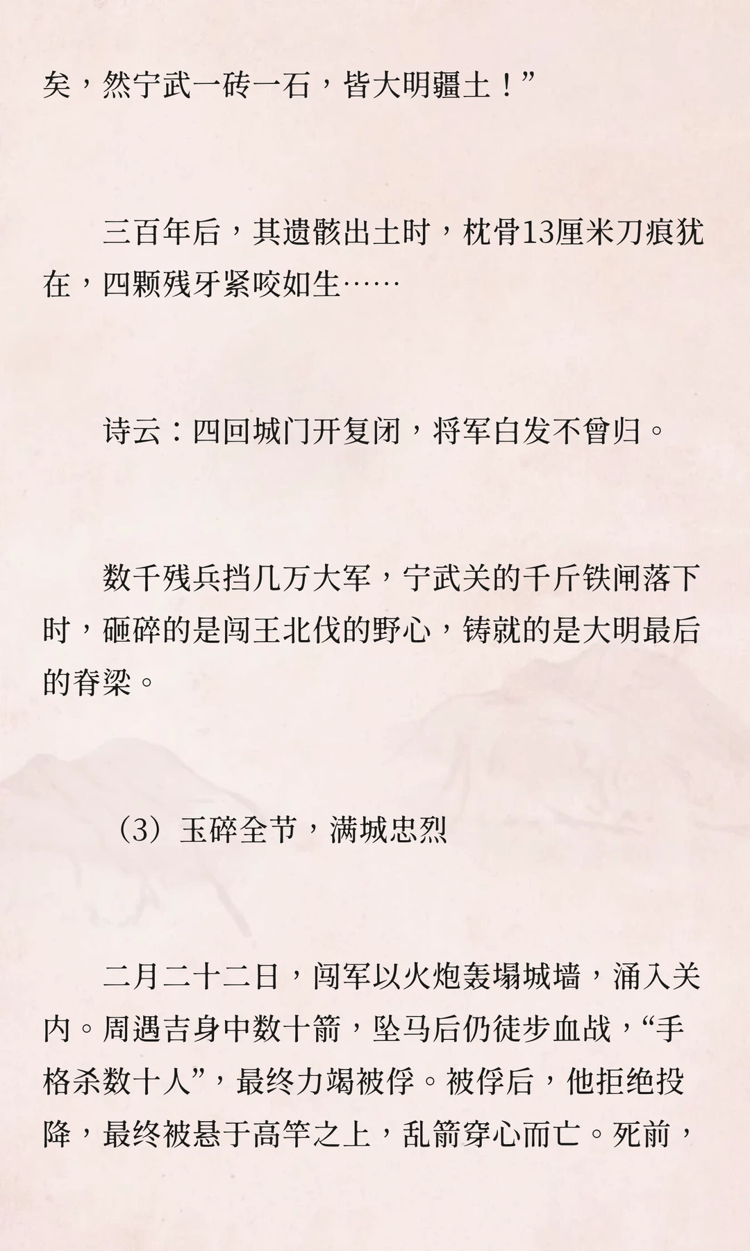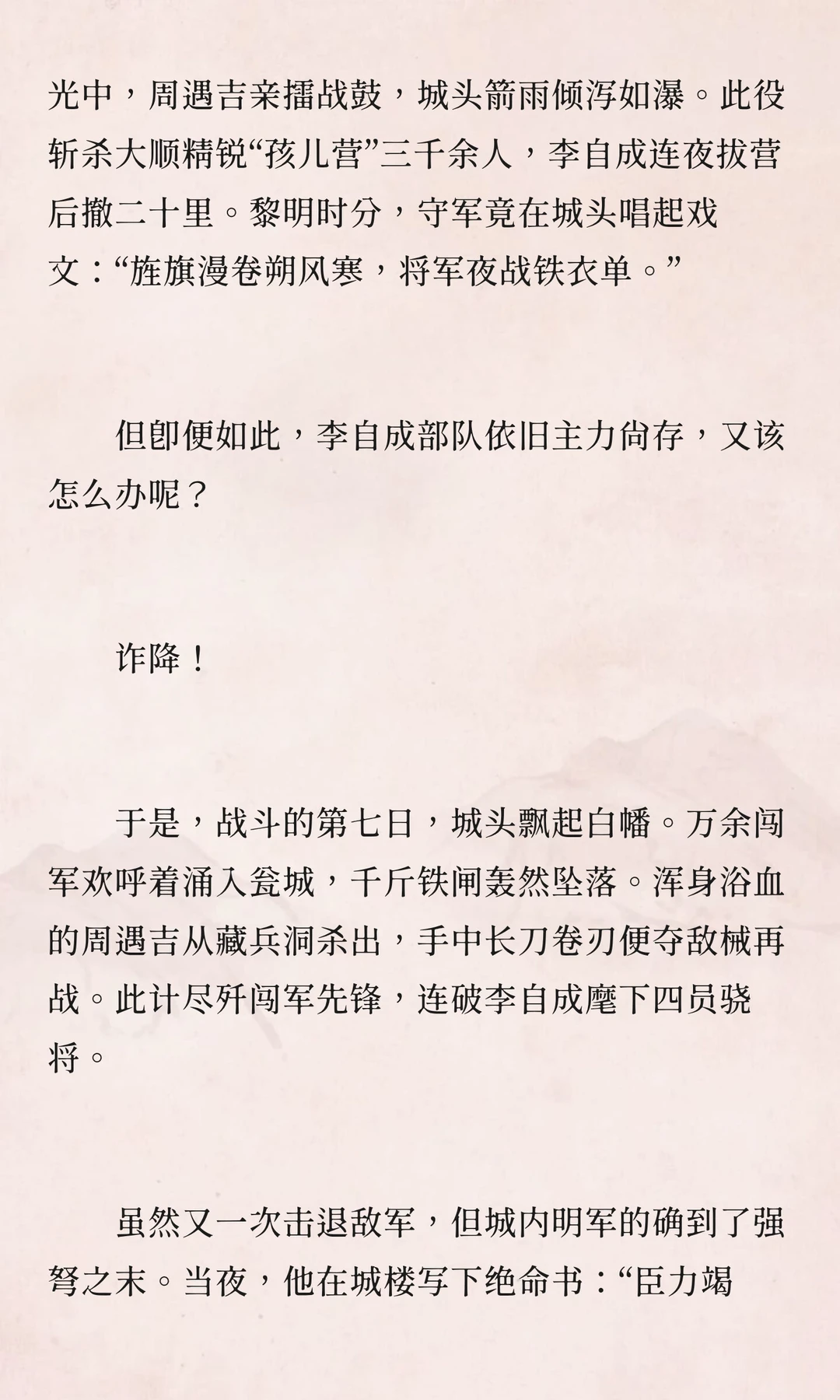 李自成攻占山西时,宁武关守将周遇吉坚守孤城,与数十万闯军激战十日,最终被俘后英勇就义。他的忠义之举成为明末悲歌中最壮烈的音符,展现了武人的尊严。