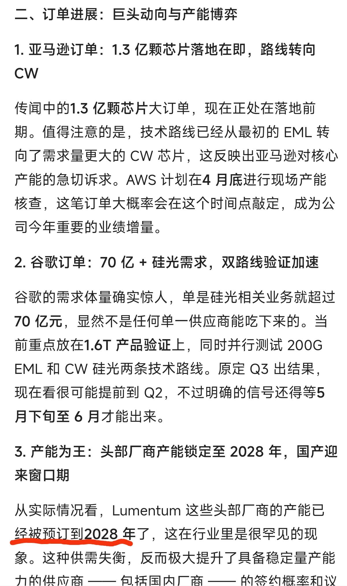 3、Lumentum这些头部厂商的产能已经被预订到2028年了。